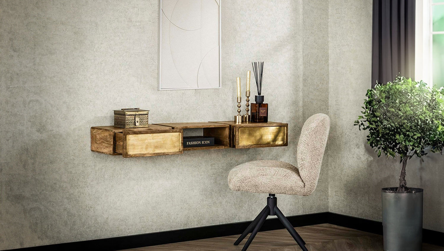 Der Schminktisch BRASY von KAWOLA ist ein Statement von zeitloser Eleganz und luxuriösem Flair. Gefertigt aus massivem Mangoholz, besticht er durch seine natürlichen Holztöne, die perfekt mit den edlen Messingbeschlägen harmonieren. Das echte, leicht antikisierte Messing verleiht den Fronten eine exklusive, schimmernde Patina, die alle Blicke auf sich zieht. BRASY bietet mit einem offenen Fach und zwei praktischen Schubladen intelligenten Stauraum. Die Montage erfolgt denkbar einfach über stabile Streifen, die direkt an der Wand befestigt werden, wodurch das Möbelstück elegant zu schweben scheint. Mit seinen Maßen von 123x30x15 cm ist dieses vielseitige Möbelstück ideal als stilvolle Frisierkommode oder als repräsentativer Flurtisch.