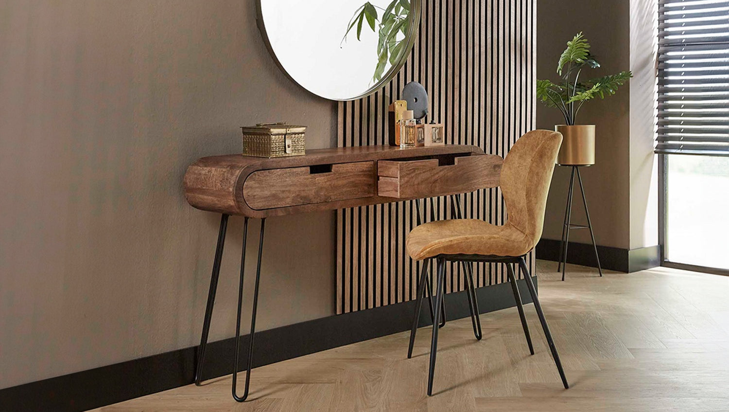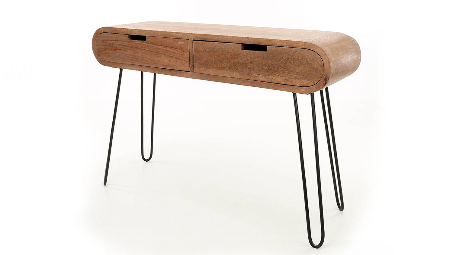 Der Schminktisch/Flurtisch BAEL von KAWOLA ist ein Statement modernen Designs, das natürliche Wärme mit urbanem Flair verbindet. Gefertigt aus hochwertigem Mangoholz mit einer tiefen braunen Oberfläche, besticht er durch seine auffällige runde Form, die ihm einen absolut trendigen Look verleiht. Die filigranen Beine aus schwarz pulverbeschichtetem Metall bilden einen stilvollen Kontrast und sorgen für höchste Stabilität. Mit zwei integrierten Schubladen bietet BAEL praktischen Stauraum, während seine Maße (120x30x76 cm) ihn vielseitig einsetzbar machen – ob als eleganter Frisiertisch für Ihr Schlafzimmer oder als einladender Flurtisch in Ihrem Eingangsbereich: ein markantes Möbelstück, das Funktionalität und Ästhetik perfekt vereint.