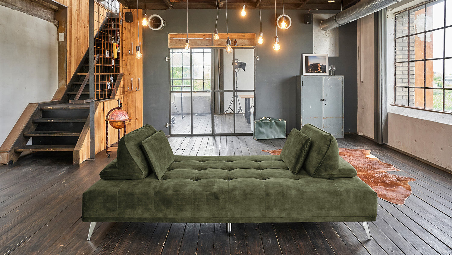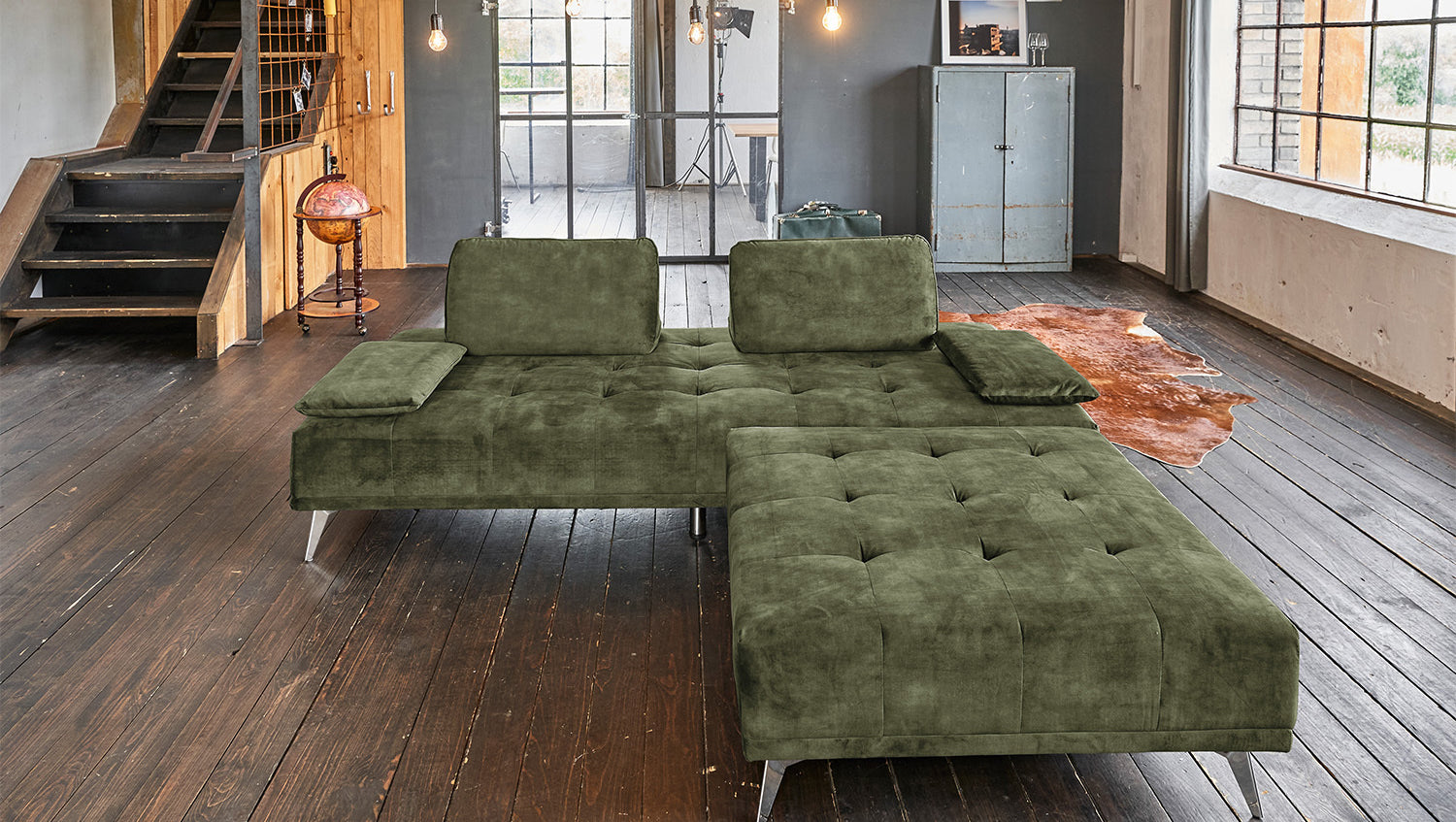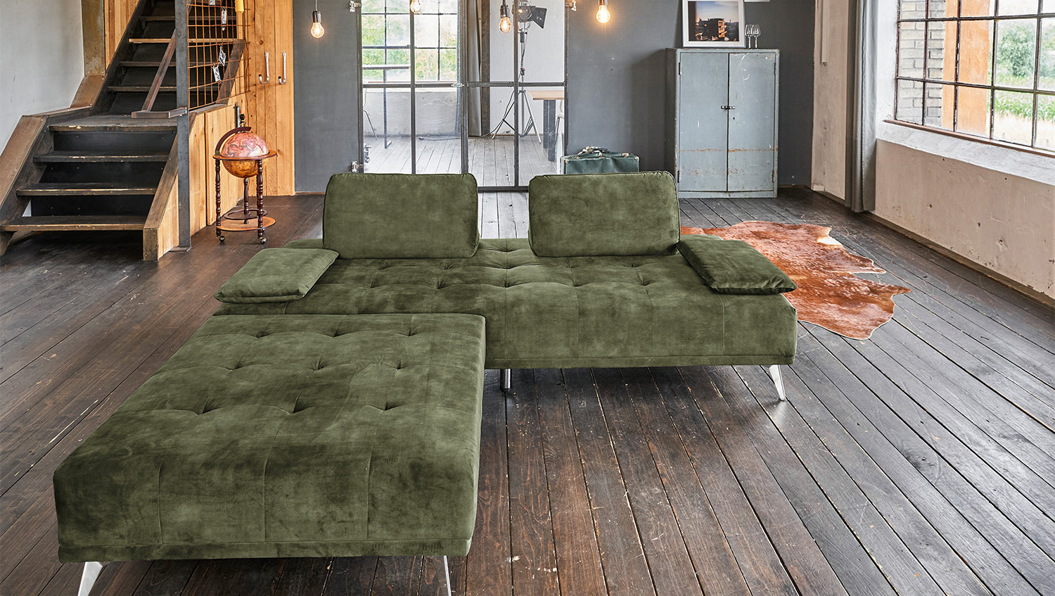 Das Sofa WIOLO von KAWOLA vereint elegantes Design mit hohem Komfort. Die elegante Absteppung in der Sitzfläche, der angenehme Velvet Bezug in moosgrün und die filigranen Füße aus Metall machen dieses Sofa zu einem echten Hingucker. Doch das moderne Tagesbett ist nicht nur optisch ansprechend. Es bietet verschiedene Nutzungsoptionen. Nutzen Sie es als stilvolles Sofa für Ihr Wohnzimmer. Der Clou: Die Rückenkissen können nach Wunsch individuell verteilt und verschoben werden. So können Sie die für Sie komfortabelste Sitz- beziehungsweise Liegeposition einnehmen. Im Handumdrehen verwandeln Sie das Sofa in ein komfortables Schlafsofa für Ihre Gäste, indem Sie die Rückenkissen entfernen. Die bequeme Liegefläche bietet ausreichend Platz zum Entspannen. Der passende Hocker ergänzt das Ensemble und sorgt für noch mehr Flexibilität im Wohnraum. Egal ob als Sofa zum Sitzen oder als Schlafsofa zum Liegen, WIOLO verleiht jedem Raum Eleganz und Komfort. Genießen Sie entspannte Stunden auf Ihrem neuen Sofa Velvet. WIOLO ist das perfekte Möbelstück für alle, die Wert auf Design und Funktionalität legen. Erleben Sie den Unterschied mit diesem komfortablen Schlafsofa.