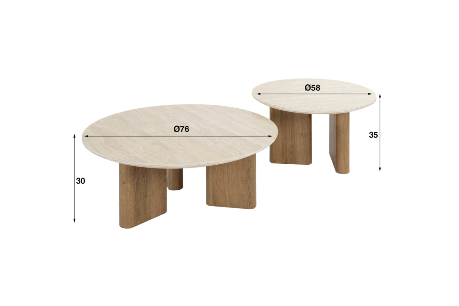 Das elegante, runde Couchtisch-Set PRETO von KAWOLA kombiniert einen stabilen Holzrahmen mit einer luxuriösen Keramikplatte in Travertinoptik, was ihm einen raffinierten Look verleiht - perfekt für moderne und klassische Interieurs. Diese Tische sind vielseitig und funktional, ein echtes Must-have! Das Set besteht aus zwei Tischen. Der größere Tisch hat einen Durchmesser von 76 cm und eine Höhe von 30 cm, der kleinere Tisch hat einen Durchmesser von 58 cm und eine Höhe von 35 cm. Ob modern, rustikal oder klassisch – das PRETO Couchtisch-Set passt sich dank seines zeitlosen Looks mühelos jedem Einrichtungsstil an. Ideal als stilvoller Mittelpunkt im Wohnzimmer und ein echtes Highlight für Liebhaber hochwertiger Möbel.