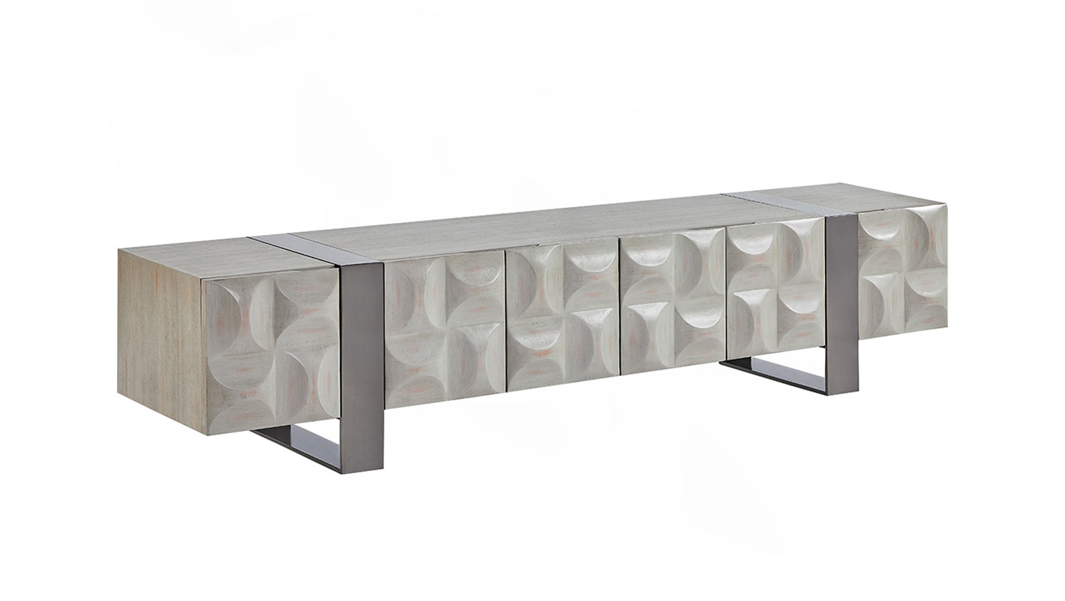 Das KAWOLA Lowboard MARGO besticht durch seine elegante Kombination aus modernem Design und praktischer Funktionalität. Mit seiner Breite von 200 cm ist es der ideale Platz für Ihren Fernseher. Der Korpus und die Türen sind stilvoll mit hochwertigem grauen Ulmenholz furniert, das dem Möbelstück eine luxuriöse Optik verleiht. Die vier Türen bieten großzügigen Stauraum und lassen sich dank des Muldengriffes an der Oberseite mühelos öffnen. Die silberfarbenen Kufenfüße aus gebürstetem Edelstahl sorgen für einen modernen, zeitlosen Look und bieten gleichzeitig stabile Standfestigkeit. Das TV-Board MARGO von KAWOLA fügt sich perfekt in jedes Wohnambiente ein und ist ideal für Liebhaber von ausgefallenen, aber dennoch eleganten Möbelstücken. Entdecken Sie die perfekte Kombination aus Design und Funktionalität mit dem Sideboard MARGO!