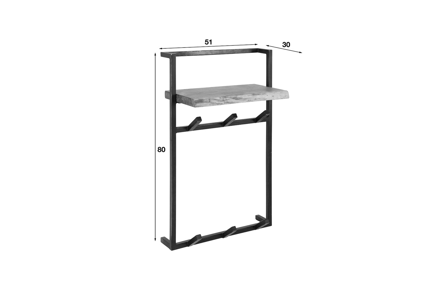 Die Wandgarderobe RAICA von KAWOLA kombiniert hochwertiges massives Akazienholz mit funktionalem Design. Die sorgfältig ausgewählte Hutablage besticht durch ihre feine Maserung und natürlichen Äste, die ihr einen einzigartigen Look verleihen. Nach traditionellen Methoden verarbeitet, sorgt sie für eine stilvolle Optik an der Wand. Insgesamt 6 schwarz geschliffene Metallhaken - 3 an der Ablage und 3 an der Unterseite - bieten vielseitige Aufhängemöglichkeiten für Jacken, Taschen oder Accessoires. Dank zwei Befestigungsösen lässt sich die 51 cm breite, 80 cm hohe und 30 cm tiefe Garderobe mühelos montieren. Perfekt für Flur, Diele oder Eingangsbereich, bietet RAICA eine stilvolle Lösung für mehr Ordnung!