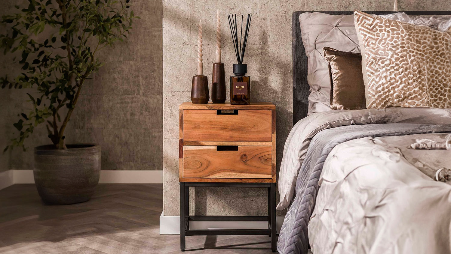 Der Nachttisch FATY von KAWOLA vereint modernes Design mit natürlicher Eleganz. Er ist aus Akazienholz gefertigt und mit einem matten, transparenten Lack versehen, der die natürliche Optik des Holzes betont. Der Nachttisch verfügt über zwei geräumige Schubladen und einen Metallrahmen, der für ein modernes und elegantes Aussehen sorgt. Mit seinen kompakten Maßen von 40 x 30 cm und einer Höhe von 60 cm ist er die ideale Lösung für kleinere Räume. Der Nachttisch FATY ist nicht nur funktional, sondern auch ein echter Blickfang – perfekt für moderne, minimalistische oder rustikale Einrichtungen. Setzen Sie stilvolle Akzente mit diesem platzsparenden Nachttisch aus Akazienholz!