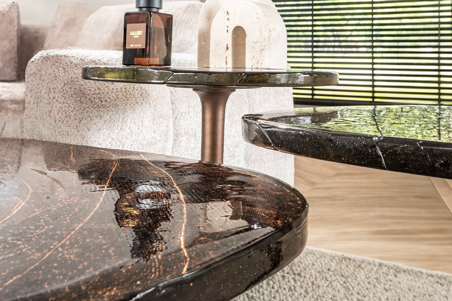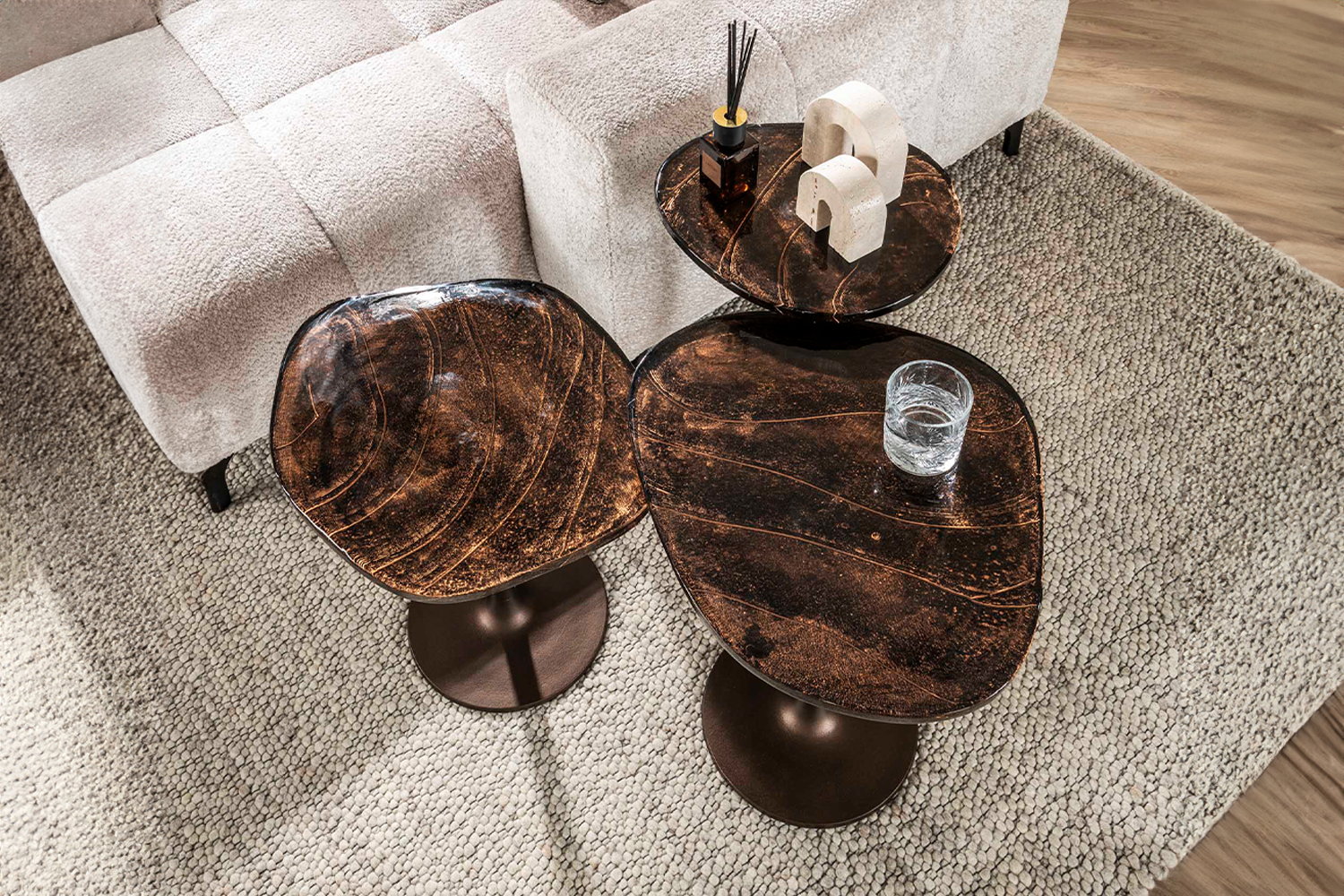 Ergänzende Details:Charaktervolle Glasplatte mit sanft gewellter Oberfläche Metallgestell in elegantem Antikkupfer Finish Vielseitig einsetzbar als Ablage oder dekoratives Highlight Passt perfekt in stilvolle Wohn und Loungebereiche