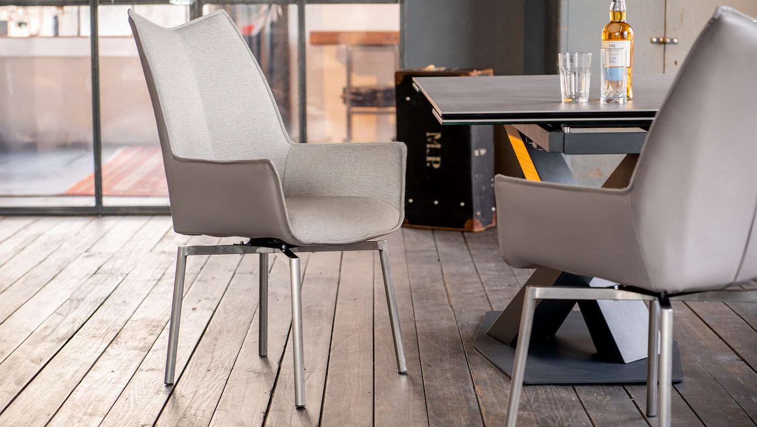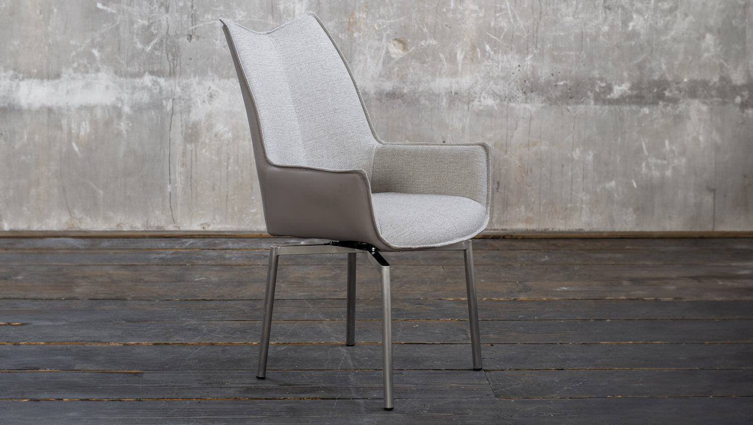 Esta silla es 2a oportunidad de una devolución de un cliente, que tiene ciertos defectos de menor importancia y por lo tanto es ofrecido por nosotros a un precio reducido. Los posibles defectos son: Arañazos en el armazón, marcas de presión, ligera suciedad y desviaciones de color en la tapicería, así como desgarros en la tela de los bajos. Por favor, eche un vistazo a las fotos de defectos directamente después de la foto principal. Sólo sirven para ilustrar posibles defectos. Se trata de imágenes de ejemplo generales y no representan el artículo en cuestión. El artículo no presenta necesariamente todos los defectos indicados. Las telas y colores de tapicería que aparecen en las imágenes de defectos tampoco se refieren a este artículo. La silla de comedor KAWOLA STINE convence por su elaboración de alta calidad y su diseño especial. La combinación de la piel sintética gris en el exterior de la carcasa del asiento y la tela flexible del asiento convierten a la silla en la estrella de cualquier comedor, y no sólo visualmente. Los elegantes pies de acero inoxidable cepillado tienen función giratoria y redondean la silla a la perfección. La forma y el tapizado de la silla garantizan un agradable confort de asiento. STINE no sólo destaca en el comedor, ya que la silla también es perfecta para su uso en el contract.