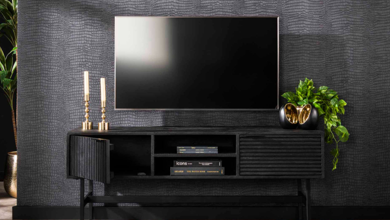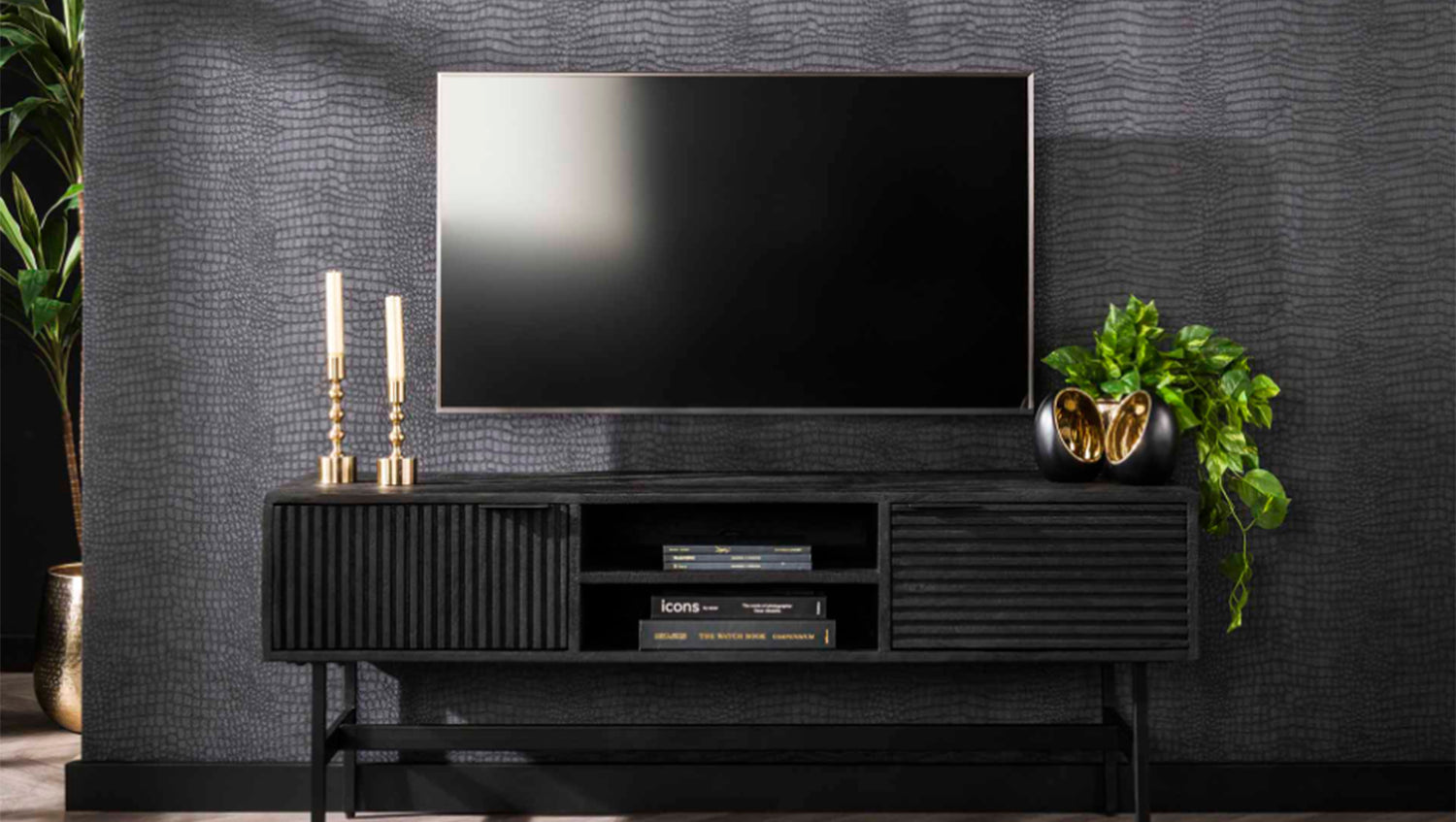 El Mueble bajo ELVAS de KAWOLA impresiona por su moderno diseño y sus materiales de alta calidad. Fabricado en madera de mango de alta calidad y acabado en un lacado negro intenso, aporta un toque de estilo a cualquier salón. La superficie especialmente lisa confiere al mueble un tacto exclusivo y un aspecto elegante. Con 140 cm de ancho, el Aparador ofrece mucho espacio para televisores y tecnología. El Mueble bajo ELVAS combina la funcionalidad con un estilo moderno y encaja perfectamente en conceptos de vida minimalistas o industriales. Un elegante punto de atracción para cualquier salón.