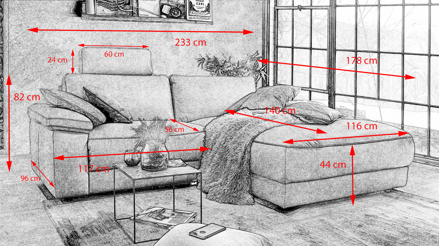 El sofá esquinero KAWOLA LOLA convence por su aspecto atemporal. Además, este mueble es muy funcional. El elemento de asiento derecho dispone de una función de reclinación motorizada que permite desplazar el respaldo hacia atrás y extender el reposapiés. Otro elemento destacado es el reposacabezas con aspecto de cojín, que también puede ajustarse a voluntad. El armazón es de madera maciza encolada y las superficies del asiento y el respaldo son muy cómodas gracias a su estructura de varias capas. La funda de cuero de alta calidad de estilo vintage es muy fácil de cuidar y confiere al sofá una elegancia clásica. Los pies de plástico empotrados con aspecto flotante crean un atractivo contraste. El acolchado muy desenfadado del asiento, el respaldo y los reposabrazos ofrece además una gran comodidad de asiento. El sofá esquinero LOLA se integra a la perfección en cualquier entorno y destaca en cualquier lugar.