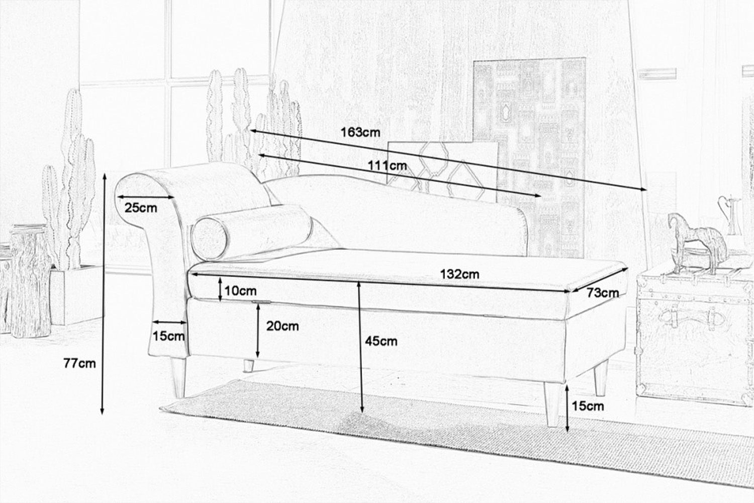 El asiento de la tumbona acolchada se puede abatir hacia delante para que, por ejemplo, se puedan guardar maravillosamente debajo mantas de día o cojines. La tumbona está revestida en todo su contorno con un bonito tejido, por lo que también se puede colocar en el centro de la habitación. Ya sea en el dormitorio, en el salón o en la habitación de invitados, la tumbona SARAH destaca en todas partes. Aquí podrá pasar horas leyendo o simplemente relajándose después de un duro día de trabajo.