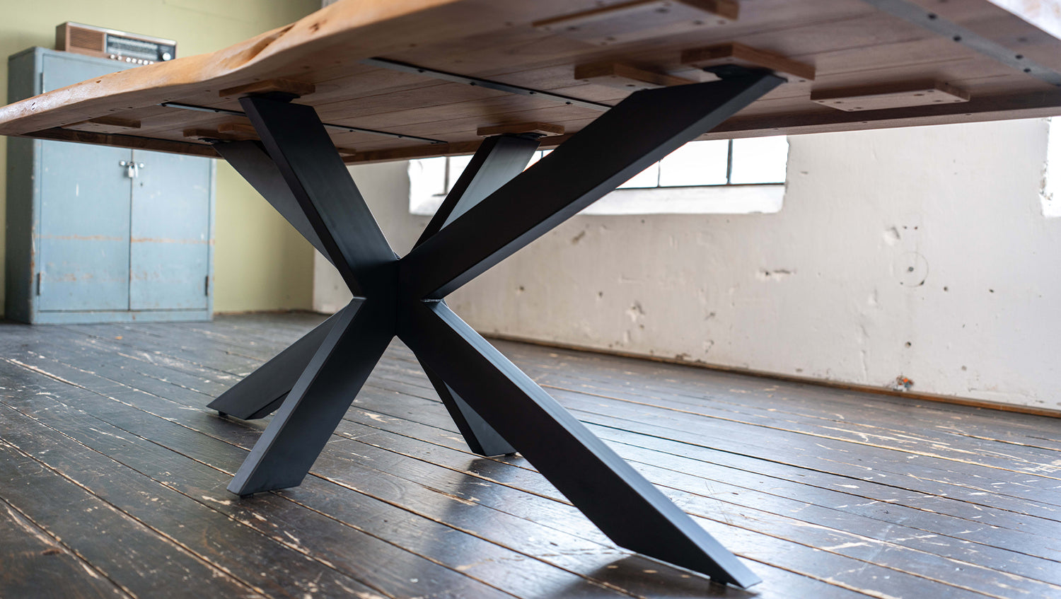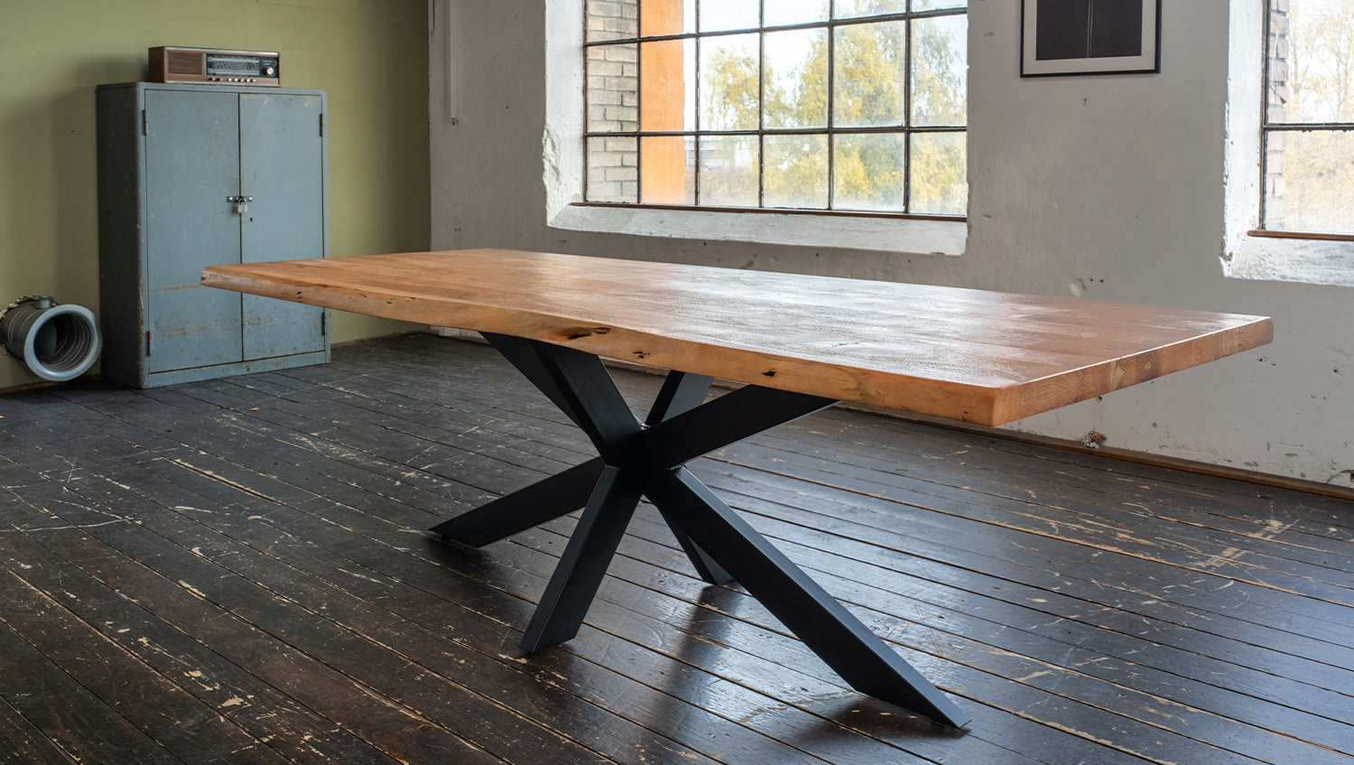 La mesa de madera maciza SELVA de KAWOLA combina un diseño atemporal con materiales naturales. La superficie del tablero de madera maciza de acacia está cepillada y es de color roble, lo que acentúa a la perfección el veteado natural de la madera. Impresiona con su característico borde de árbol, que refleja el crecimiento natural de la madera. Cada tablero es único y confiere a su comedor un ambiente cálido y acogedor. Disponible en longitudes de 200 cm, 220 cm, 240 cm, 260 cm, 280 cm y 300 cm, esta mesa de madera maciza ofrece espacio de sobra para veladas acogedoras o cenas con estilo. El bastidor rústico de base soldada de diseño industrial, pintado de negro y con una llamativa base de araña, confiere a la mesa un toque moderno e industrial. La Mesa de comedor SELVA no es sólo un mueble, sino una declaración de intenciones de alta calidad y diseño moderno. Perfecta para quienes desean combinar naturalidad y urbanidad en su hogar. Lleve un trozo de naturaleza a su comedor.