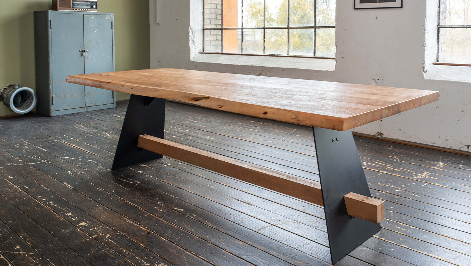 La mesa de madera maciza ARBORIO de KAWOLA convence por su elegante diseño y sus materiales de alta calidad. La superficie del tablero de madera maciza de acacia está cepillada y es de color roble, lo que acentúa a la perfección el veteado natural de la madera. Impresiona con su característico borde de árbol, que refleja el crecimiento natural de la madera. Cada tablero es único y confiere a su comedor un ambiente cálido y acogedor. Disponible en longitudes de 200 cm, 220 cm, 240 cm, 260 cm, 280 cm y 300 cm, la mesa ofrece el espacio perfecto para cenas elegantes o veladas sociales. El bastidor de base rústico soldado y lacado en negro en diseño industrial confiere a la mesa un toque moderno e industrial. La Mesa de comedor ARBORIO combina funcionalidad y sofisticación estética. Ya sea como centro de mesa en el comedor o como elemento destacado en espacios abiertos, esta mesa es toda una declaración de diseño moderno y acabado de alta calidad.