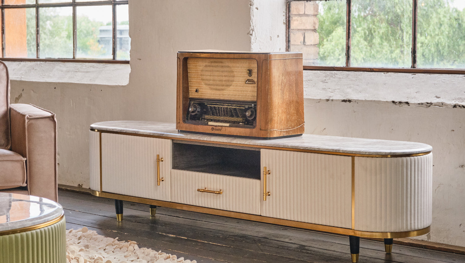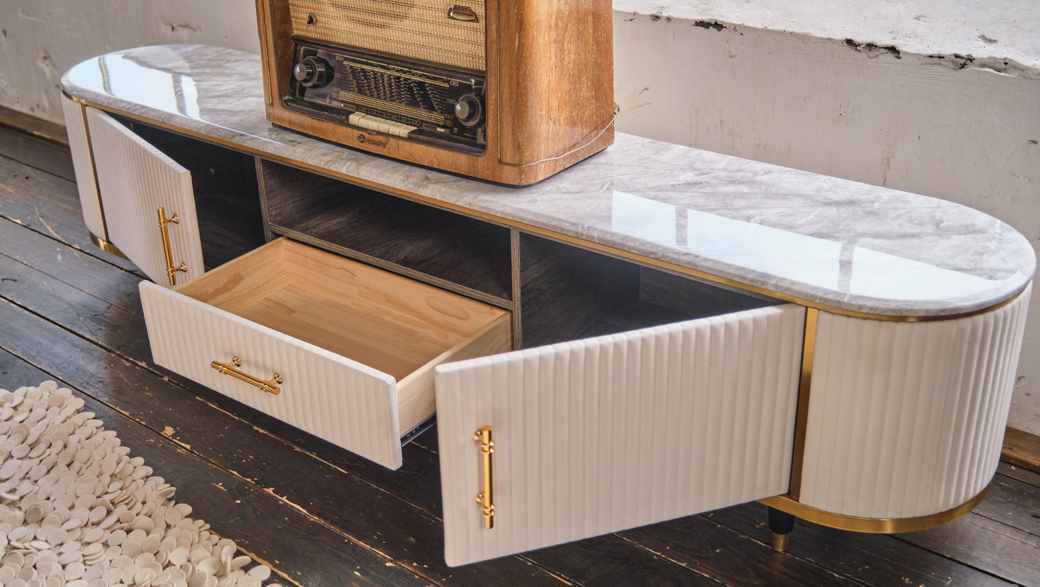 Mueble bajo para TV MARIA, de KAWOLA, superficie de mármol, piel sintética, color blanco