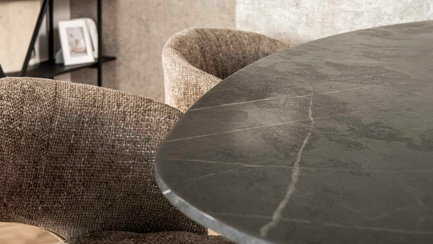 La mesa de bar SESTA de KAWOLA impresiona por su aspecto cerámico de alta calidad y su diseño moderno. El tablero de la mesa hecho a mano con borde biselado está fabricado en melamina, que se aplica sobre el material base a alta presión y temperatura. El resultado: una superficie especialmente resistente que casi no se distingue de la cerámica auténtica. La elegante forma ovalada danesa se combina con un robusto marco transversal de acero, una combinación que le confiere un carácter a la vez moderno y atemporal. Con sus dimensiones de 140 x 80 x 93 cm, SESTA es ideal para cocinas modernas, comedores o espacios abiertos. La mesa combina a la perfección diseño, funcionalidad y facilidad de cuidado: ideal para quienes buscan soluciones elegantes de estilo industrial y aspecto cerámico.