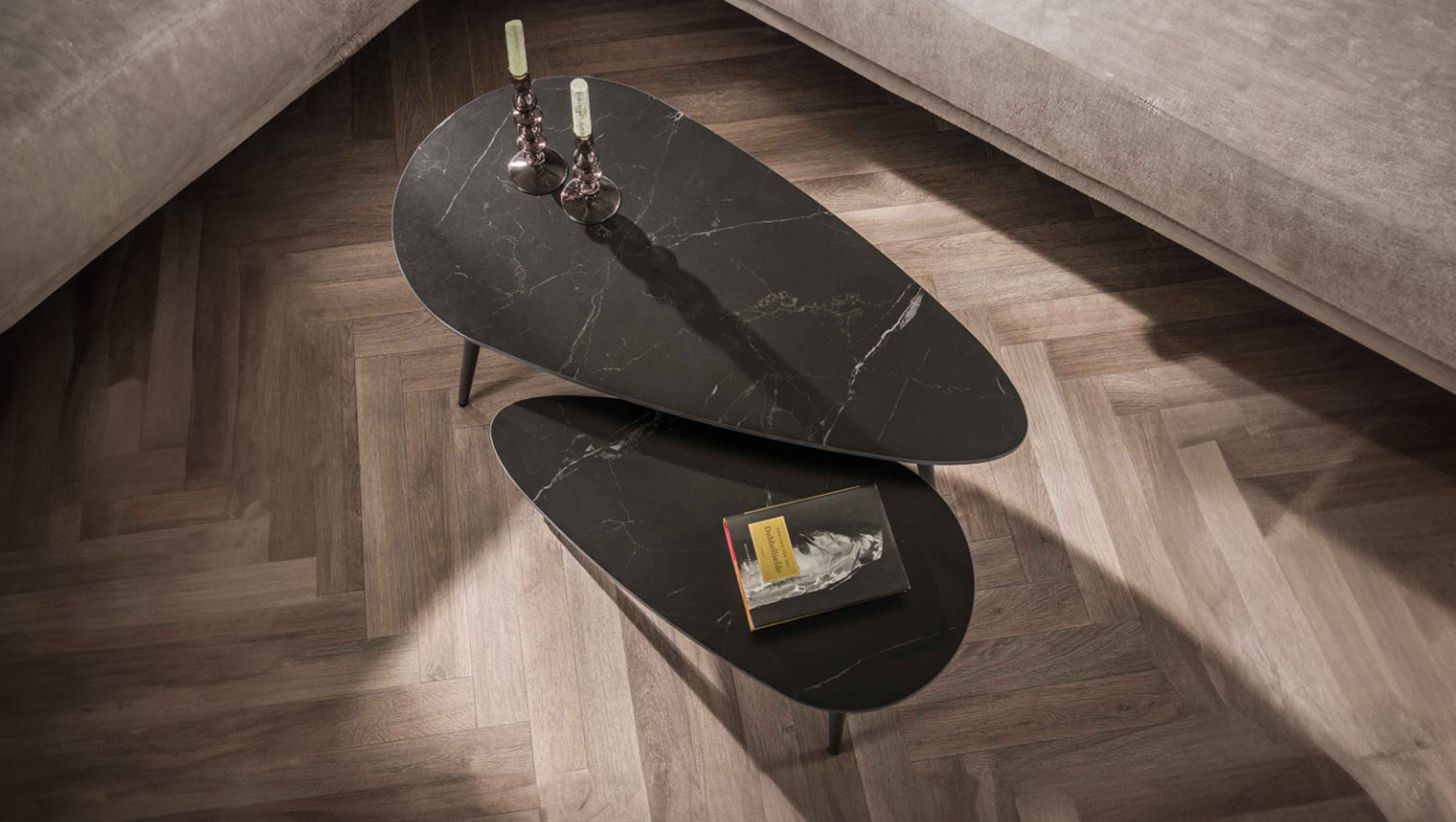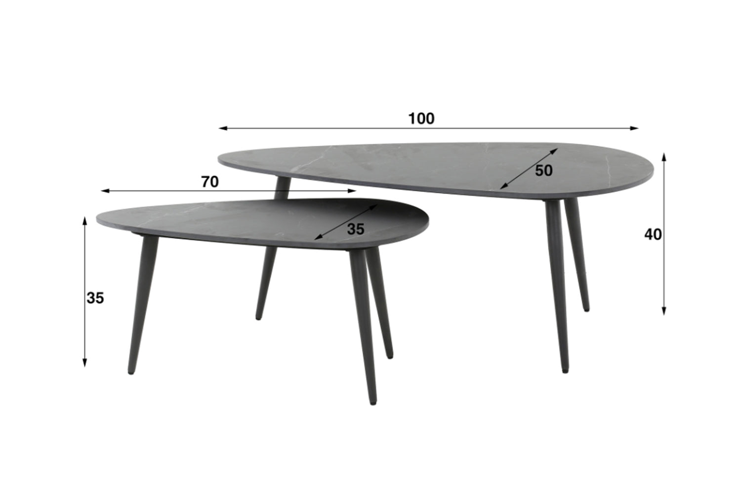 El juego de mesa de centro con forma de riñón SERIDO de KAWOLA está fabricado en cerámica negra. El tablero de cerámica confiere a este juego de dos mesas de centro un aspecto lujoso. La mesa más grande tiene una anchura de aprox. 100 cm, una profundidad de aprox. 50 cm y una altura de 40 cm. La mesa más pequeña tiene una anchura de unos 70 cm, una profundidad de unos 35 cm y una altura de 35 cm. Debido a la diferencia de altura, las mesas pueden colocarse juntas como se desee. También pueden combinarse perfectamente con diferentes estilos de mobiliario. Ya sea en un moderno loft, en un acogedor salón o en una elegante sala de estar, el juego de mesas de centro SERIDO pone acentos de estilo y combina funcionalidad con una estética atemporal.