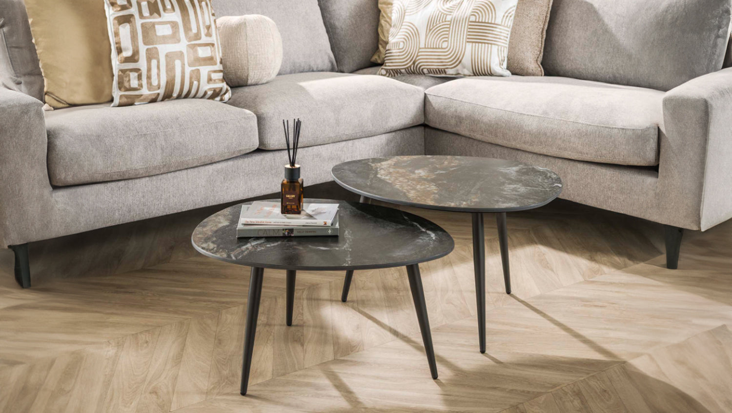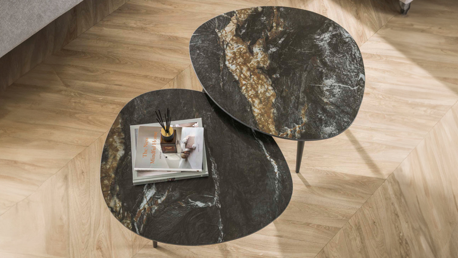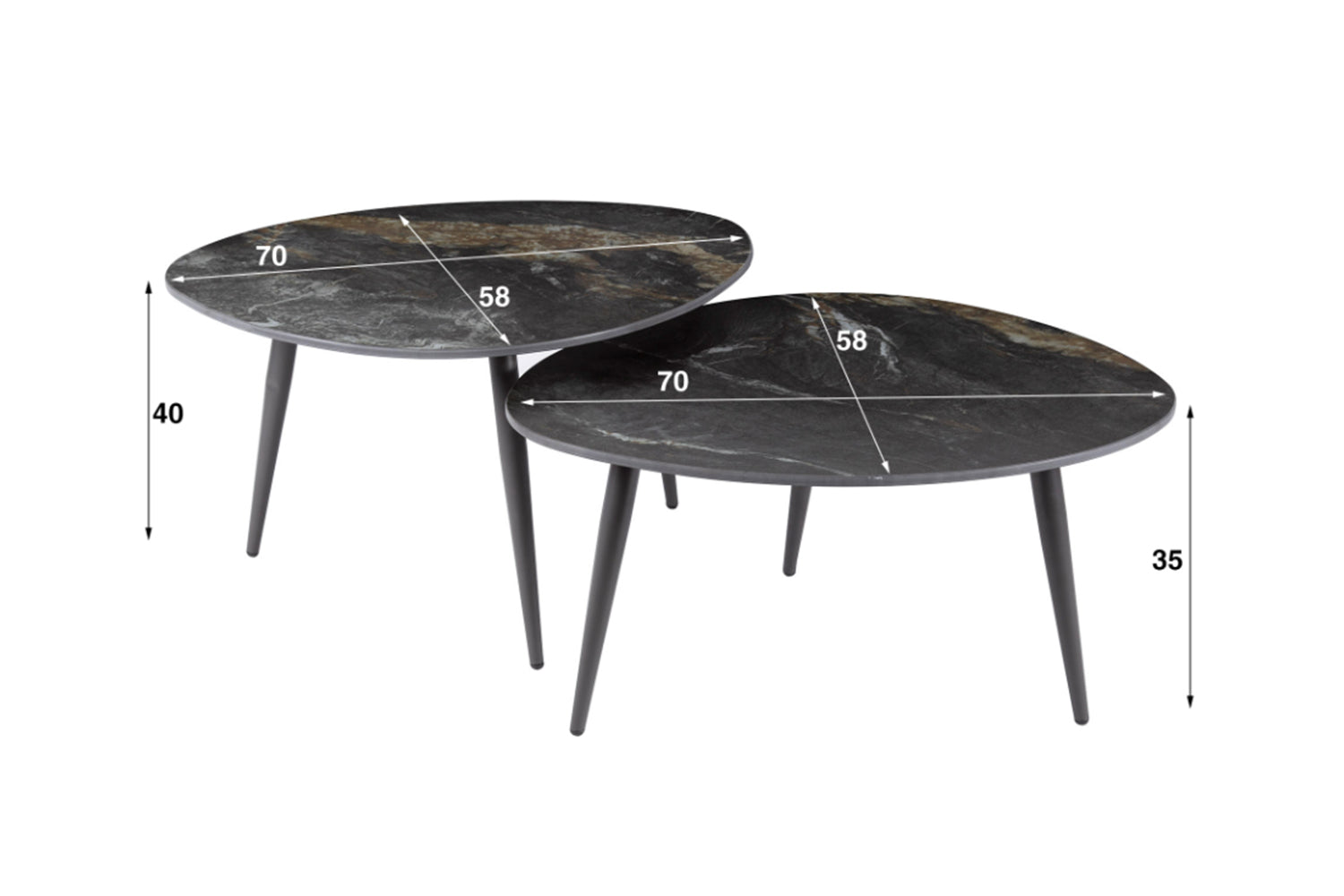 El elegante juego de mesas de centro PONTE de KAWOLA, de formas orgánicas, combina una estructura minimalista con un lujoso tablero de cerámica que le confiere un aspecto sofisticado, perfecto para interiores modernos y clásicos. Estas mesas son versátiles y funcionales. El juego consta de dos mesas. Ambas mesas tienen una superficie de 70 x 58 cm, con una altura de 40 cm y 35 cm respectivamente. Ya sea moderno, rústico o clásico, el conjunto de mesas de centro PONTE se adapta sin esfuerzo a cualquier estilo de decoración gracias a su aspecto atemporal. Ideal como centro de mesa con estilo en el salón y una auténtica atracción para los amantes de los muebles de alta calidad.