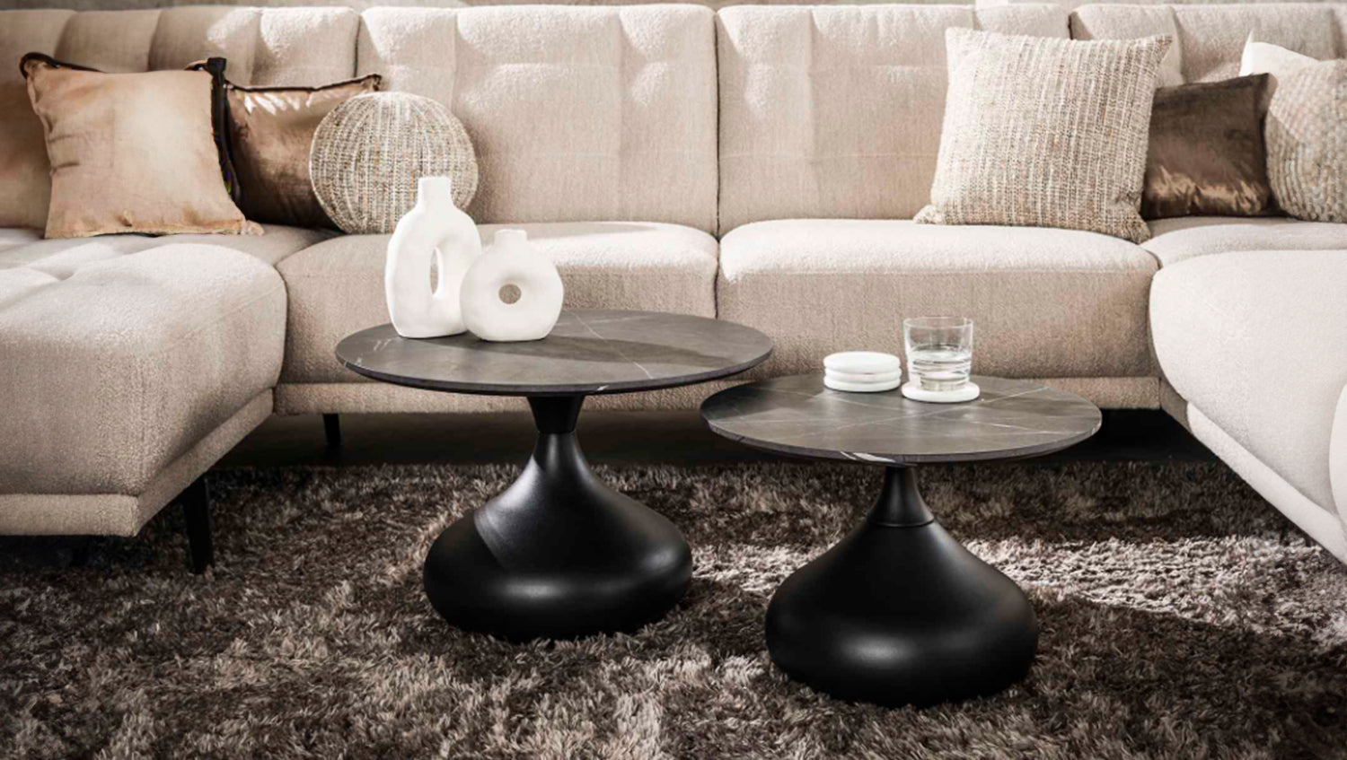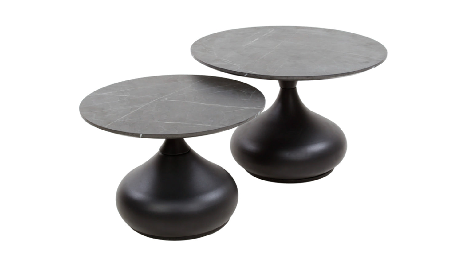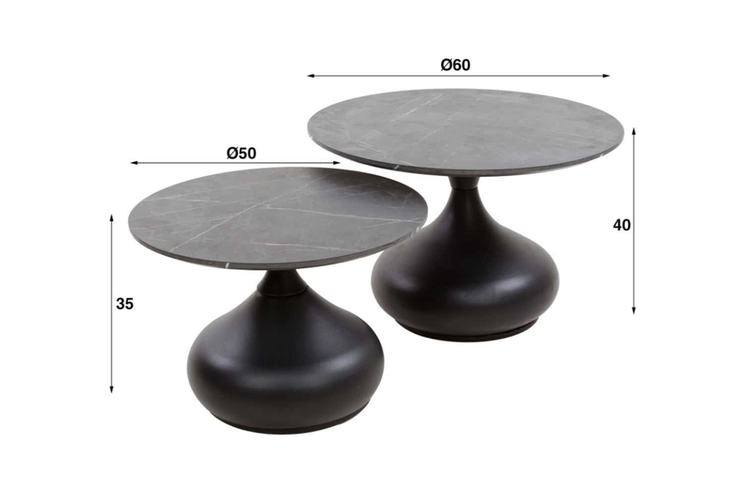 El juego de mesa de centro redonda PIRES de KAWOLA está fabricado en melamina con aspecto de cerámica y base de metal. La mesa es casi indistinguible de una mesa de cerámica. El tablero de la mesa, hecho a mano, consiste en una capa de resina de melamina que se aplica sobre madera. El material se aplica mediante calor y presión. La belleza del material en combinación con la forma de pera da como resultado una mesa moderna pero atemporal. El juego consta de dos mesas. La mesa más grande tiene un diámetro de 60 cm y una altura de 40 cm, la mesa más pequeña tiene un diámetro de 50 cm y una altura de 35 cm. Ya sea en un moderno loft, en un acogedor salón o en una elegante sala de estar, el juego de mesa de centro PIRES pone acentos de estilo y combina funcionalidad con una estética atemporal.