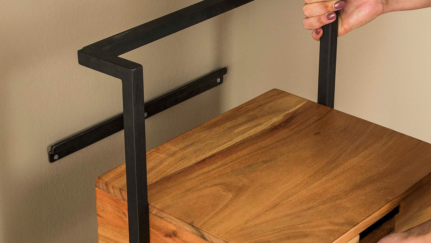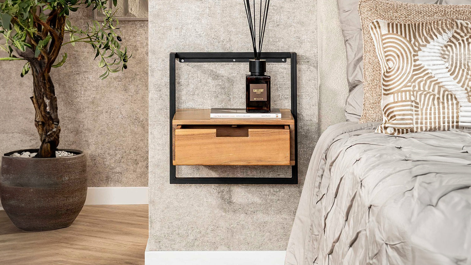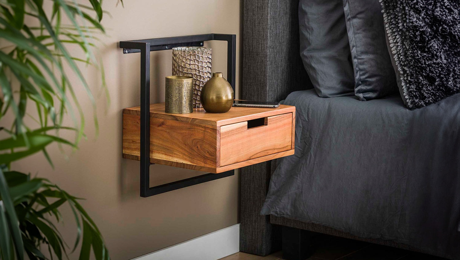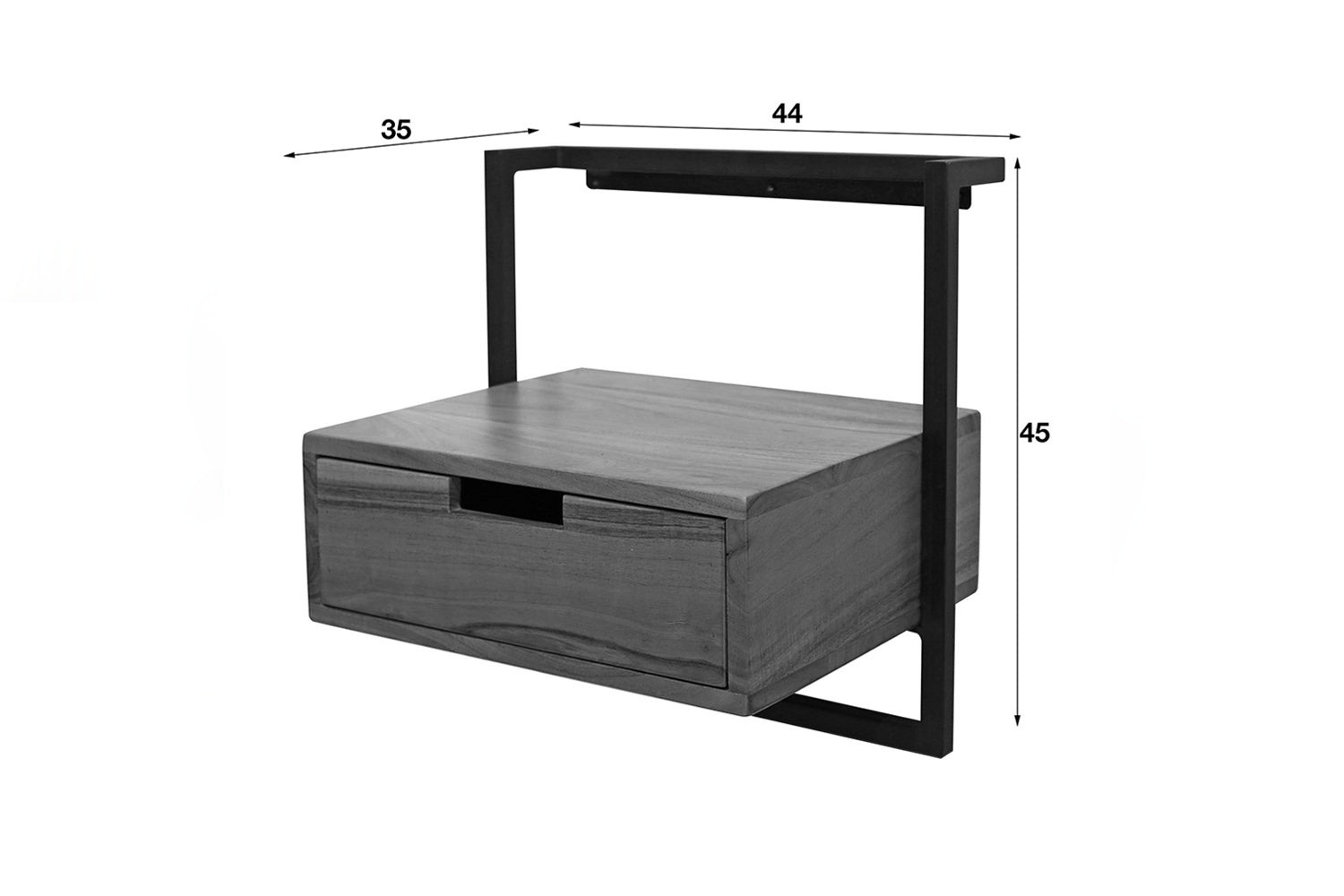 La mesilla de noche KAWOLA AIDY XL impresiona por su moderno diseño y sus materiales de alta calidad. Fabricada en madera de acacia maciza con un lacado transparente mate, aporta una elegancia natural a su dormitorio. El robusto armazón de metal no sólo proporciona estabilidad, sino también un aspecto elegante e industrial. La mesilla de noche puede fijarse a la pared de forma fácil y segura mediante un robusto listón con tres orificios para tornillos, para conseguir un aspecto flotante y ahorrar espacio. Con unas medidas de 44 x 35 x 45 cm, AIDY ofrece mucho espacio de almacenamiento y es ideal para libros, adornos u objetos cotidianos. La mesilla de noche AIDY XL es la elección perfecta para cualquiera que desee combinar funcionalidad con diseño moderno y mano de obra de alta calidad.
