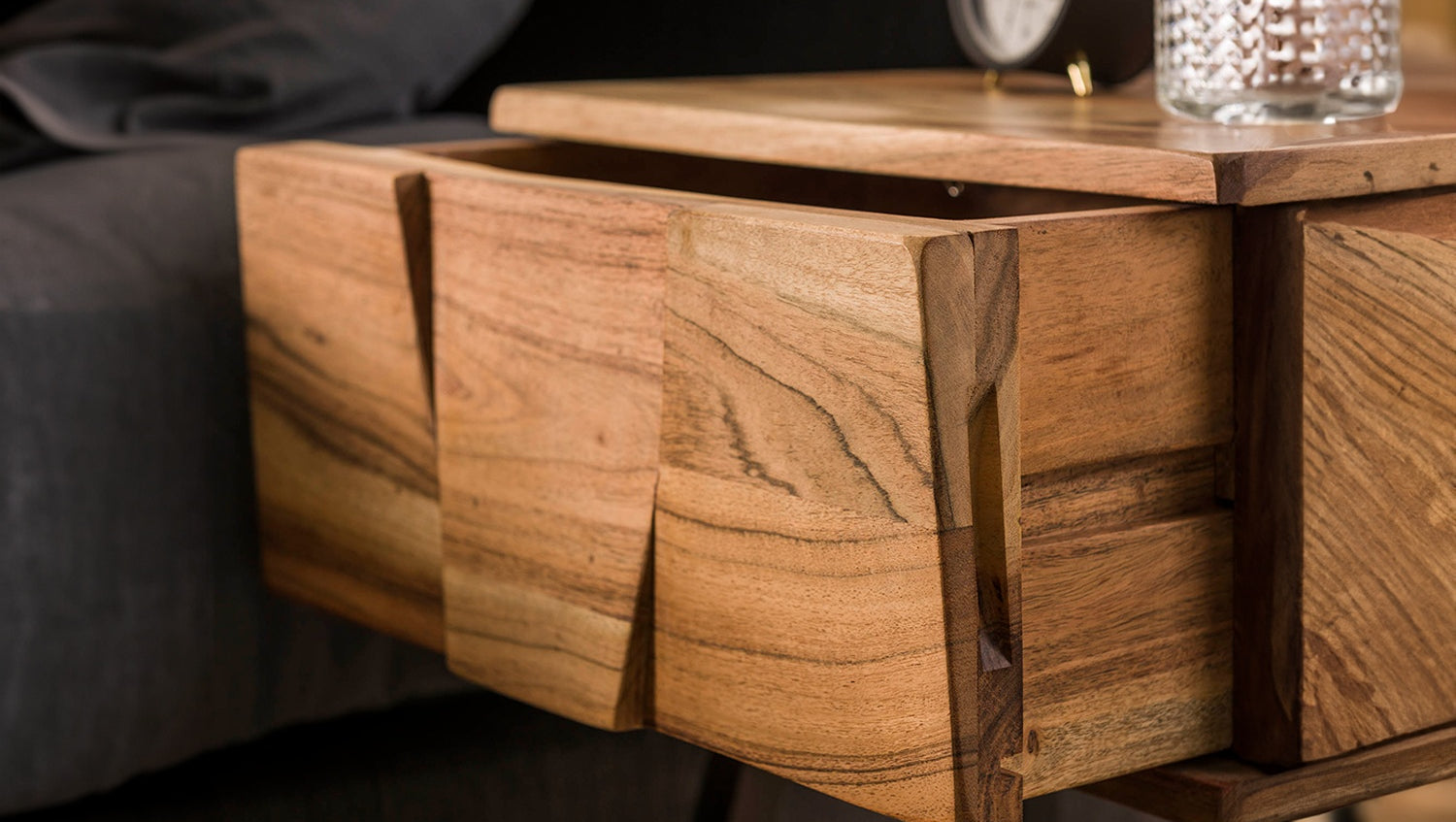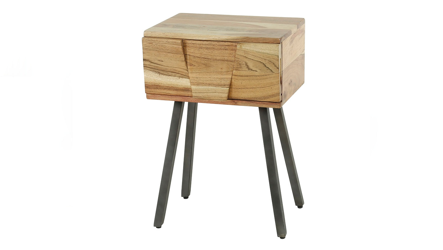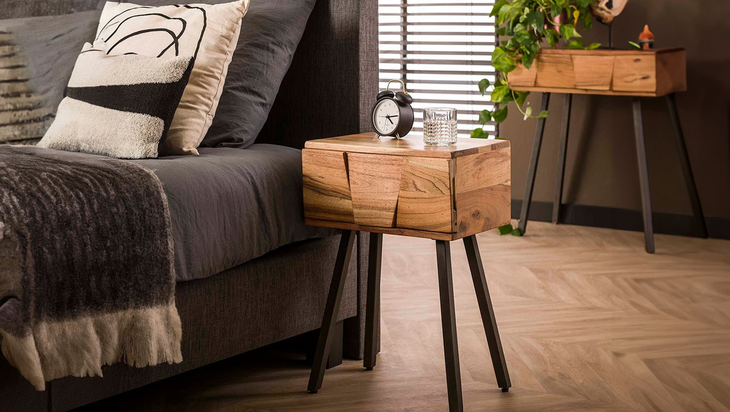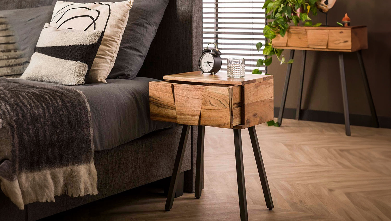 La mesita de noche ANYL de KAWOLA combina materiales naturales con un diseño moderno. Fabricada en madera de acacia de alta calidad y acabada con un lacado transparente mate, resalta con estilo el cálido veteado de la madera. Las esbeltas patas metálicas garantizan la estabilidad y añaden un elegante acento industrial. Con una anchura de 40 cm, una profundidad de 32 cm y una altura de 60 cm, la mesilla de noche ofrece suficiente espacio de almacenamiento sin dejar de ser compacta, ideal para dormitorios con poco espacio. Un práctico cajón permite guardar objetos personales y mantener el orden junto a la cama. La mesilla de noche ANYL es la elección perfecta para cualquiera que desee combinar un aspecto natural con un toque moderno. Una elegante mesilla de noche de madera de acacia para cualquier dormitorio.