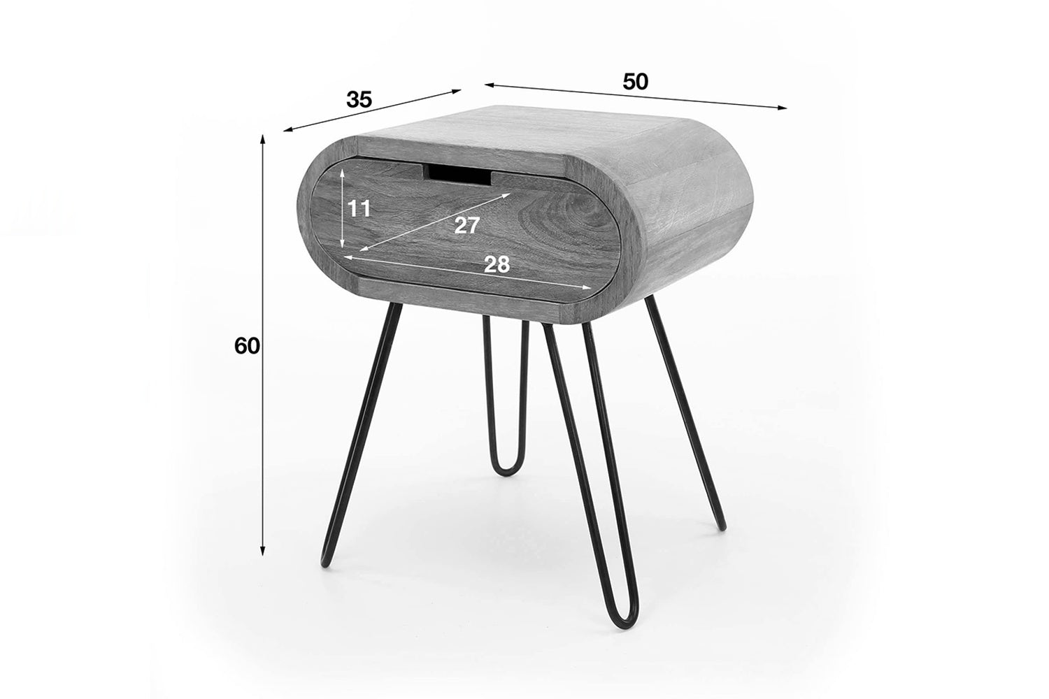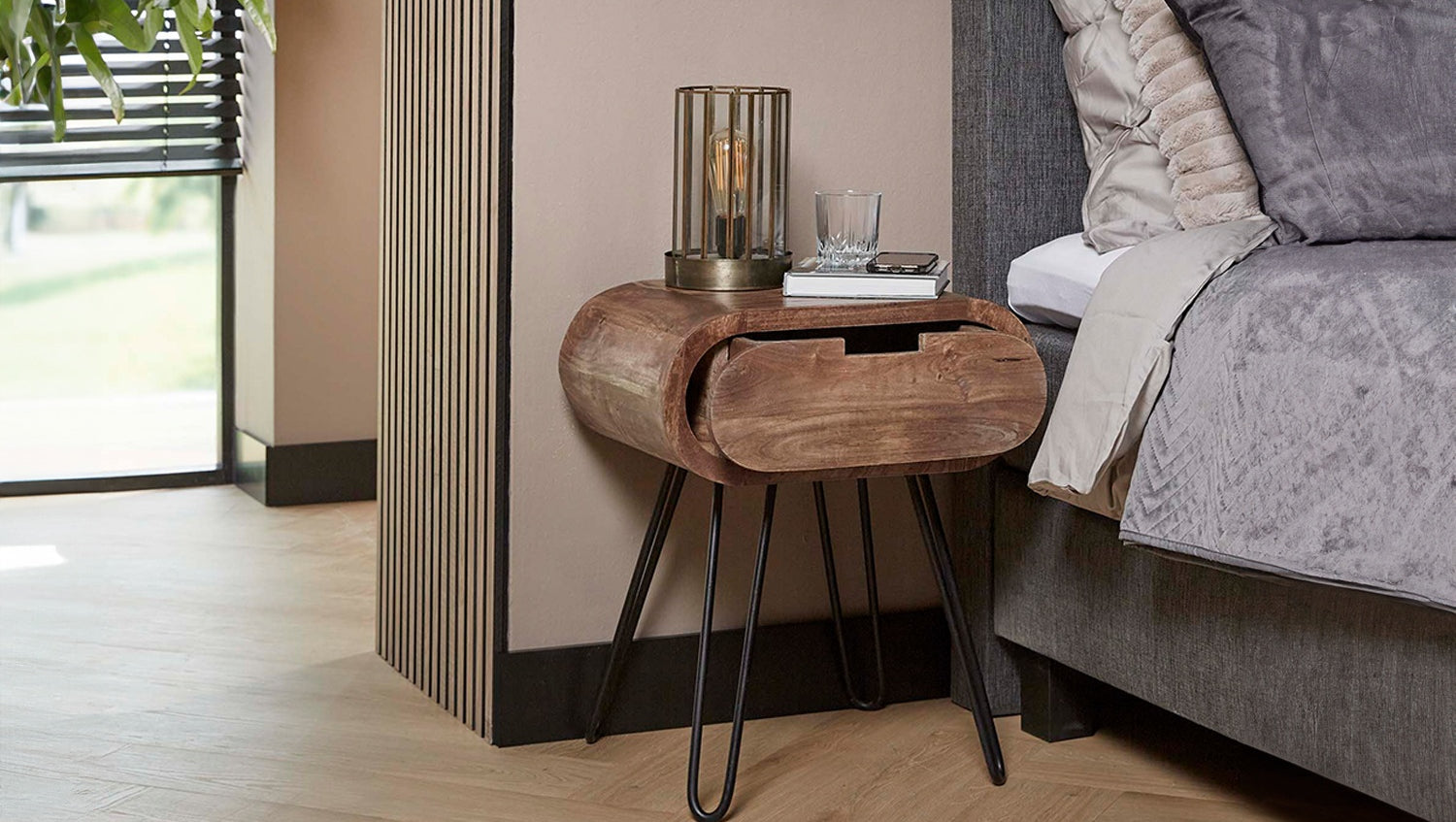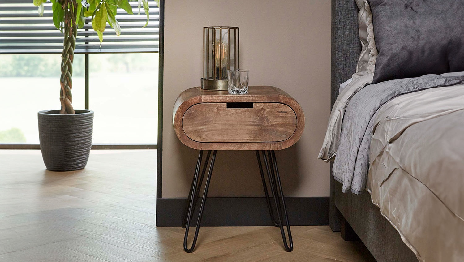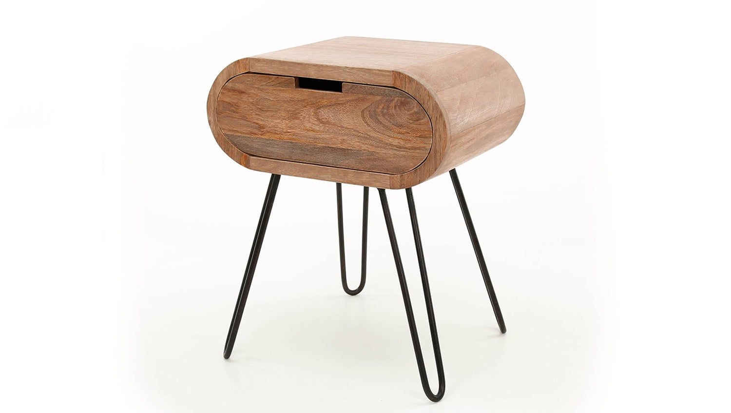 La mesilla de noche BAEL de KAWOLA convence por su diseño moderno y su elaboración de alta calidad. Fabricada en madera de mango sostenible con acabado en color arena y combinada con un marco de metal negro con recubrimiento en polvo, aporta encanto natural y elegancia moderna a su dormitorio. Su forma redondeada le confiere un aspecto suave y elegante y la convierte en el centro de todas las miradas. Un práctico cajón ofrece espacio para guardar objetos personales como libros, gafas o cargadores. Con sus dimensiones de 50 x 35 x 60 cm, BAEL puede utilizarse de diversas formas: como mesilla de noche, mesa auxiliar o elegante mueble de almacenaje. La mesilla de noche BAEL combina funcionalidad con un diseño excepcional y es ideal para conceptos de vida modernos.