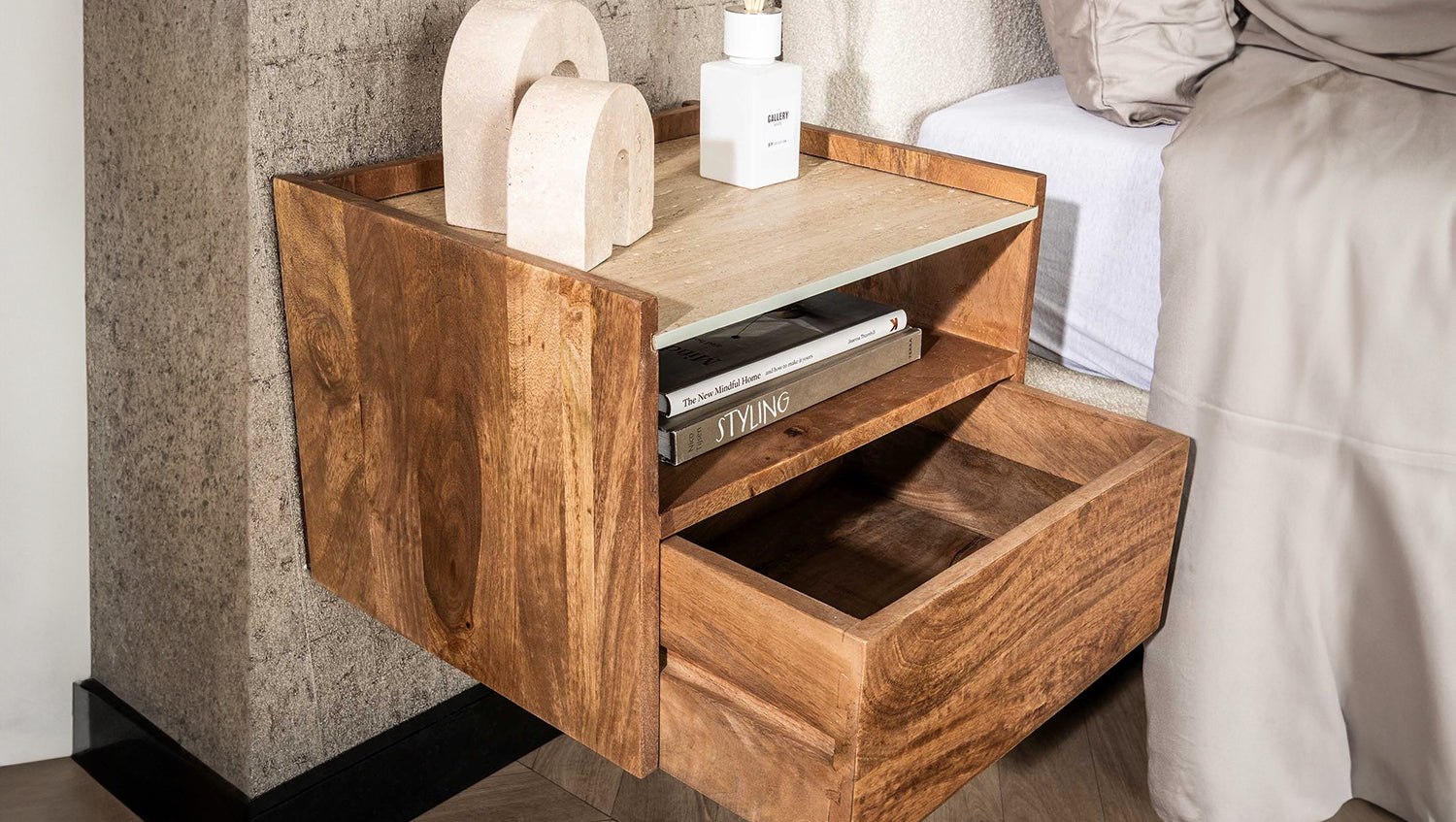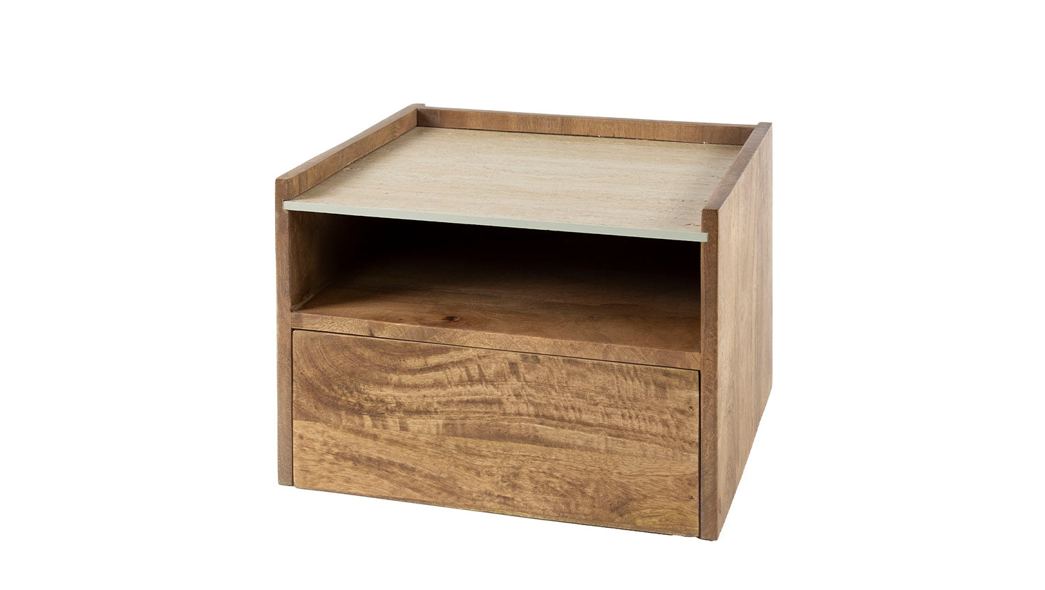 La mesilla de noche NORYN de KAWOLA combina el encanto natural con la elegancia moderna. Fabricada en madera de mango maciza, aporta calidez y carácter a tu dormitorio. La elegante encimera de cerámica en un elegante aspecto travertino da al diseño un toque lujoso y crea un aspecto sofisticado. El cajón de madera de mango integrado ofrece un práctico espacio de almacenamiento para objetos personales y mantiene la superficie ordenada. Con unas dimensiones compactas de 40 x 35 x 30 cm, NORYN es ideal para dormitorios modernos con sentido del diseño y la calidad. La mesilla de noche NORYN es la combinación perfecta de mano de obra de alta calidad, estética atemporal y diseño funcional: una declaración de estilo en cualquier entorno vital.