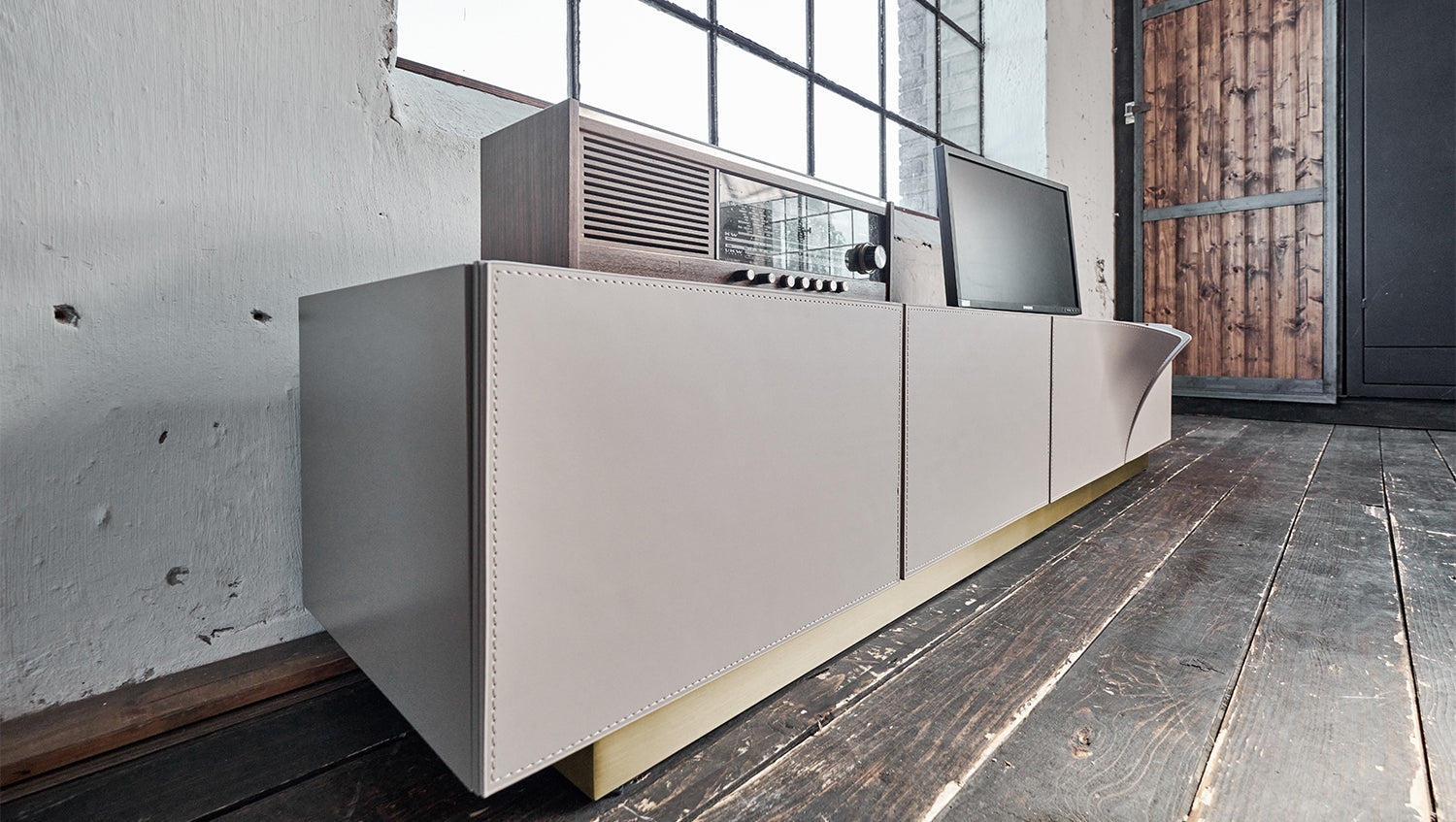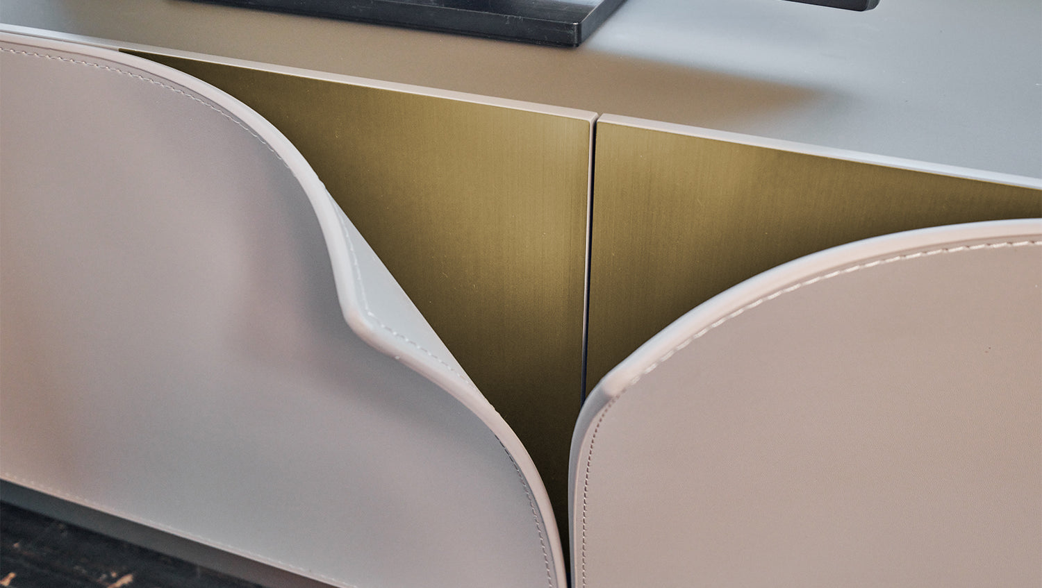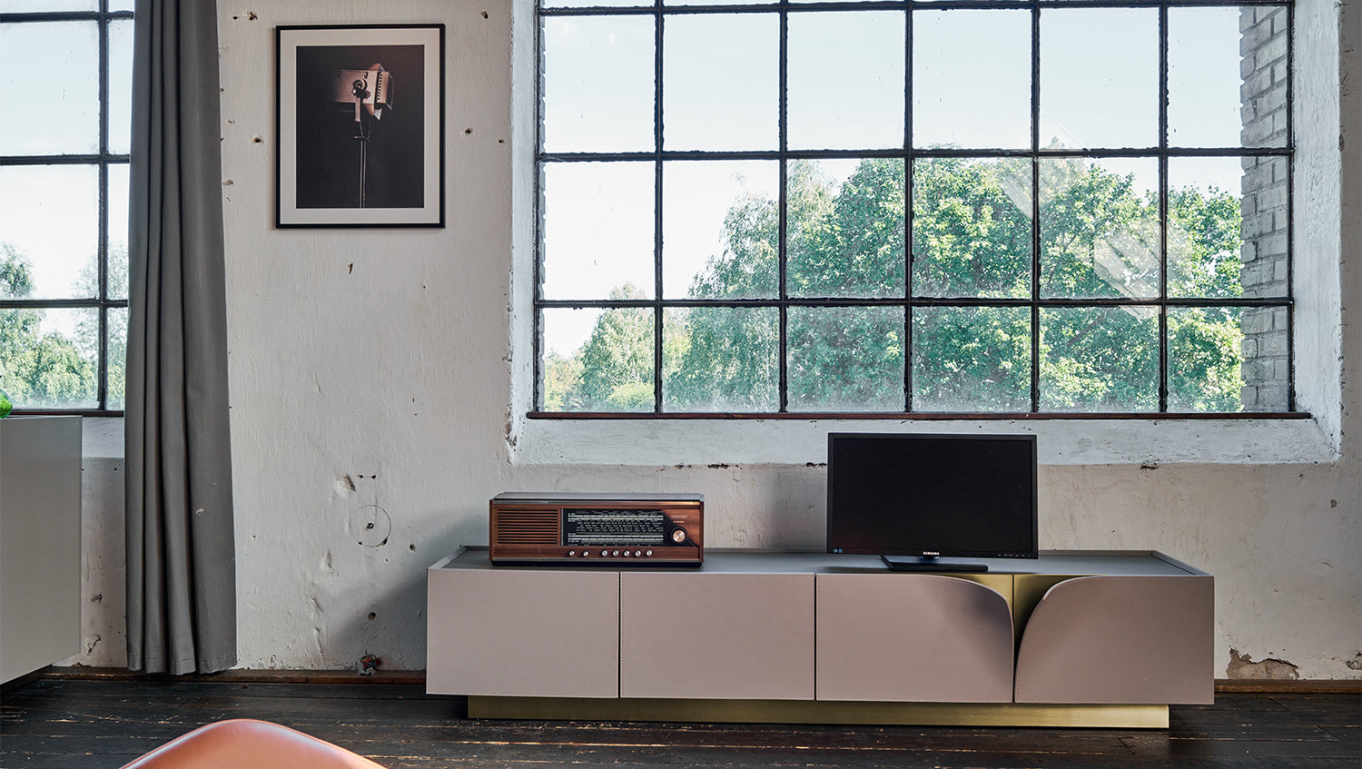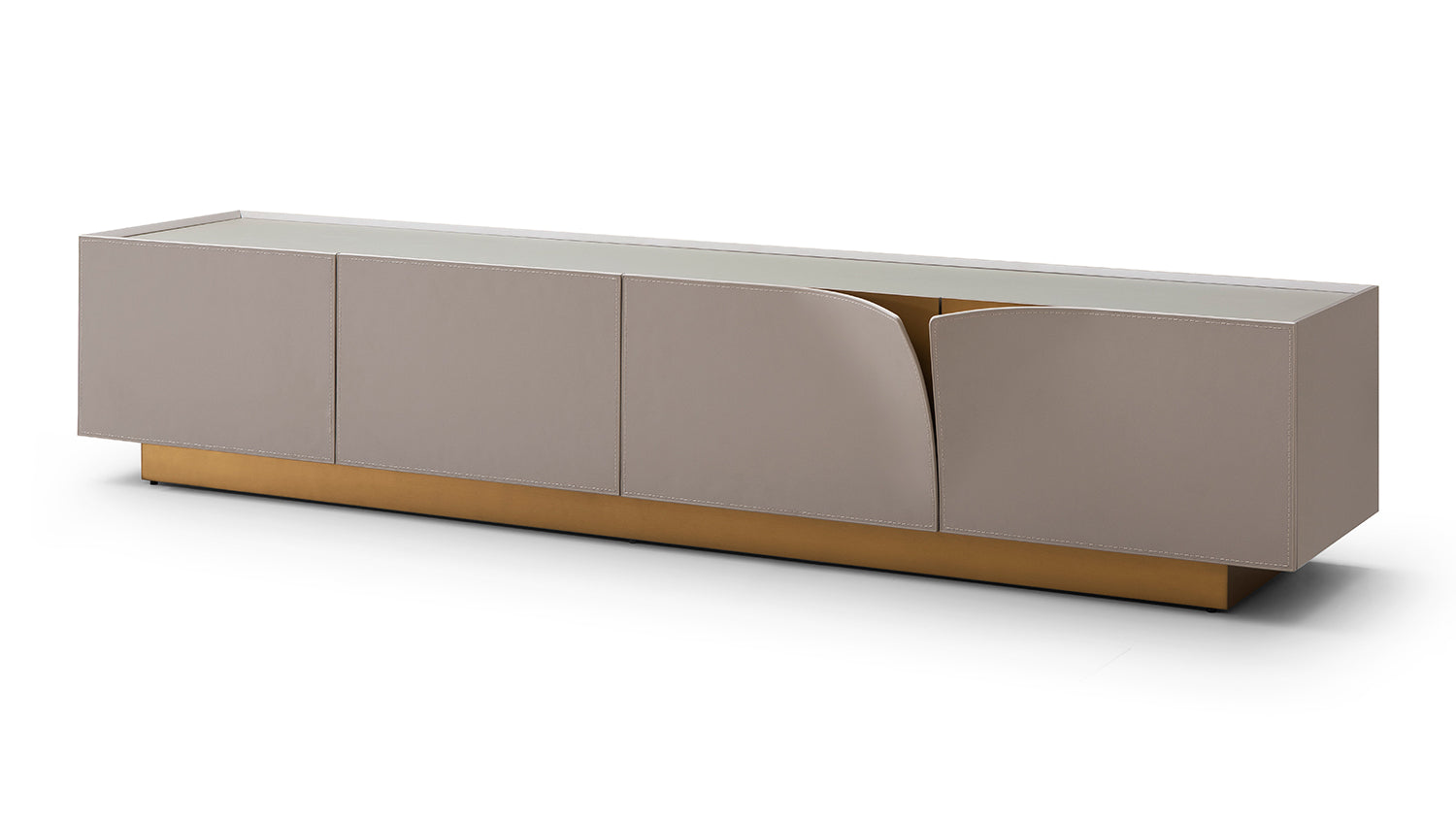 Mueble bajo para TV EMMA de KAWOLA, piel sintética, pie gris, acero inoxidable, color latón