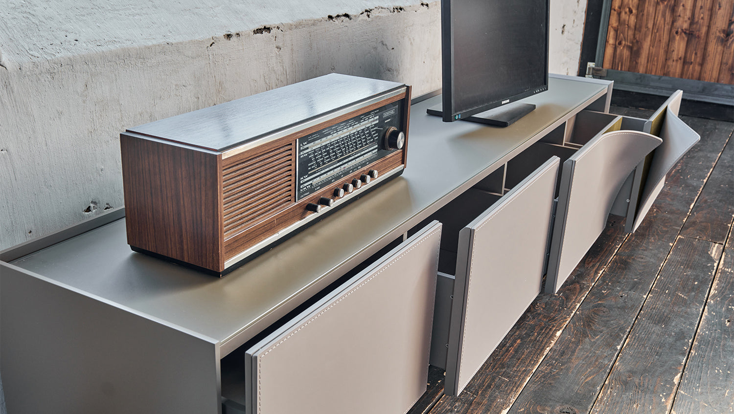 Descubra el moderno Mueble bajo EMMA de KAWOLA, un mueble con estilo de loft urbano. El Aparador gris encaja a la perfección en salones modernos. Con una altura de 42 cm, una profundidad de 42 cm y una anchura de 200 cm, ofrece un amplio espacio de almacenamiento para dispositivos multimedia, DVD, etc. El estante está diseñado para televisores de hasta 90 pulgadas, para una experiencia visual impresionante. El Mueble bajo tiene 4 compartimentos y 4 puertas para una organización óptima. El frontal metálico revestido de piel sintética sirve también de asa. El zócalo de acero inoxidable cepillado forma una base robusta y un sofisticado detalle de acento. EMMA no es sólo funcional, sino también un elemento decorativo de elegancia urbana. Disfrute de la variedad de confort y estilo de este extraordinario mueble: la fusión perfecta de estética y funcionalidad. Convierta su salón en un lugar de relajación y entretenimiento con el moderno Mueble bajo EMMA de KAWOLA. Consiga hoy mismo este Aparador de alta calidad para dar un toque de sofisticación urbana a su hogar.
