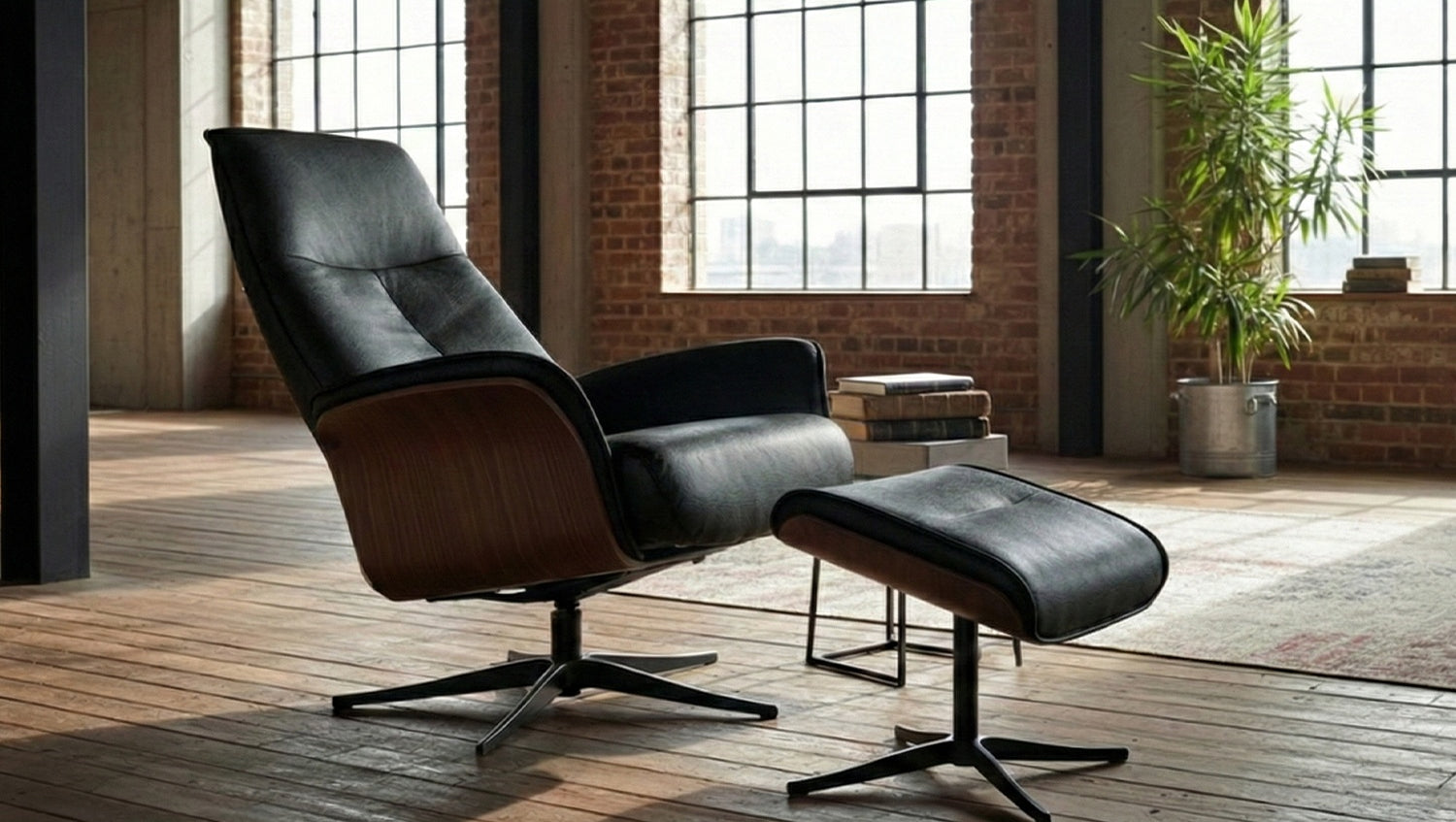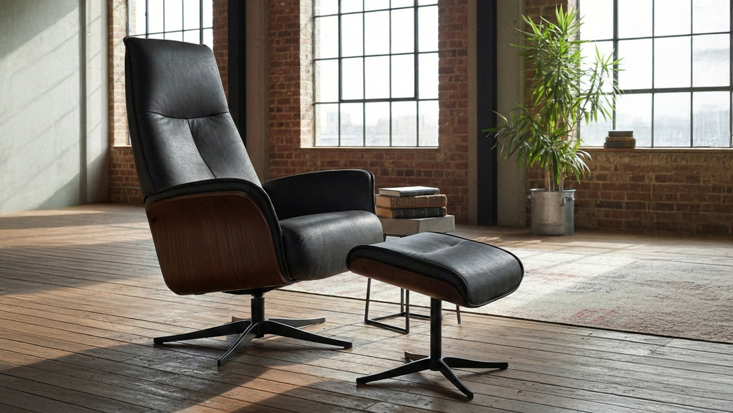 Sillón relax KAWOLA FERREIRA Sillón giratorio de cuero negro con Puf