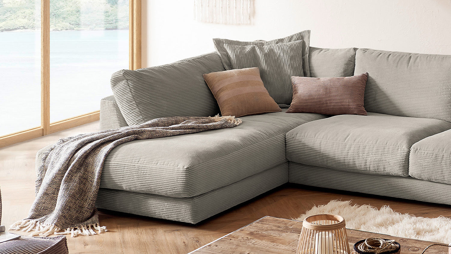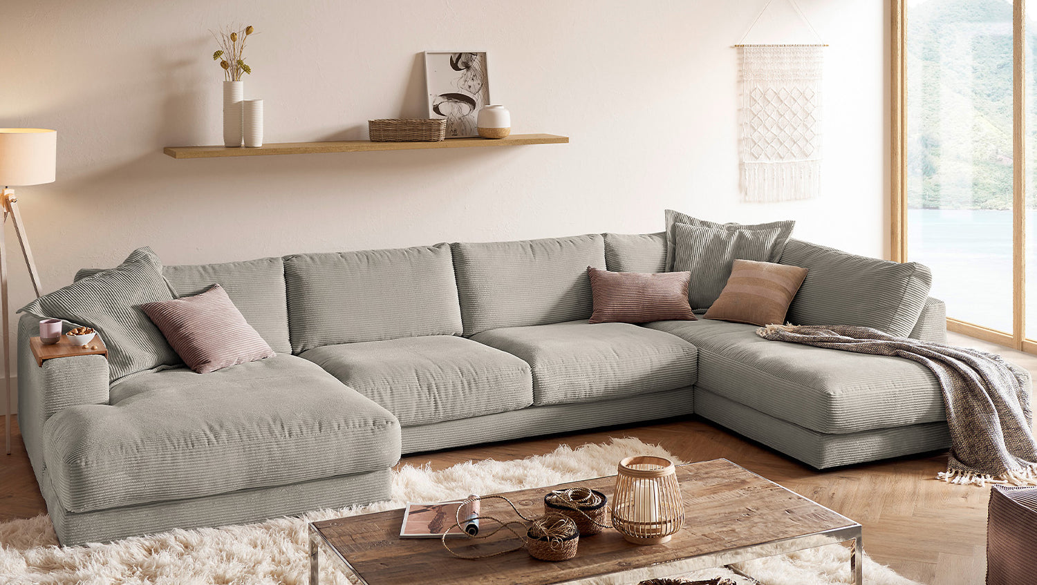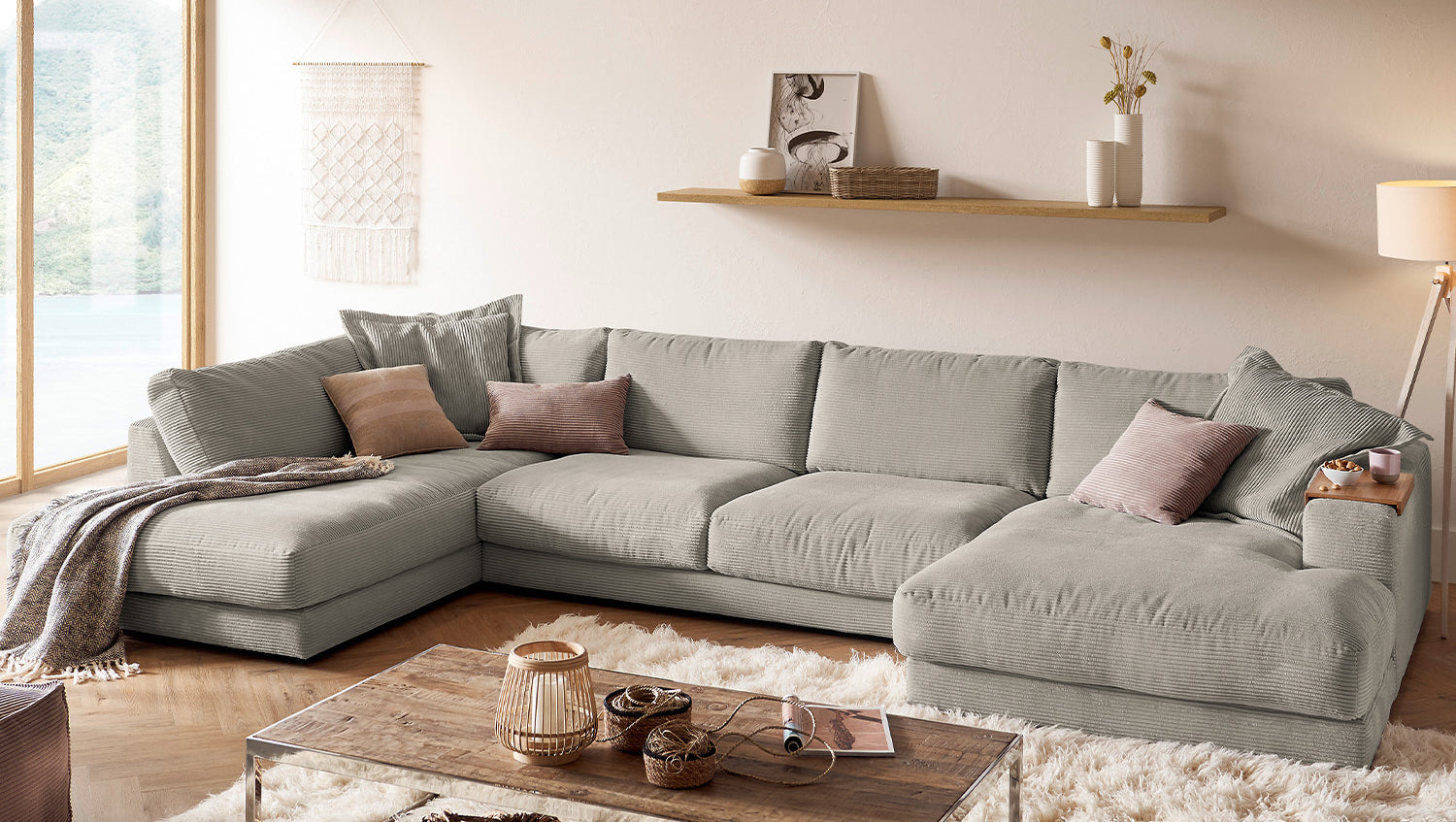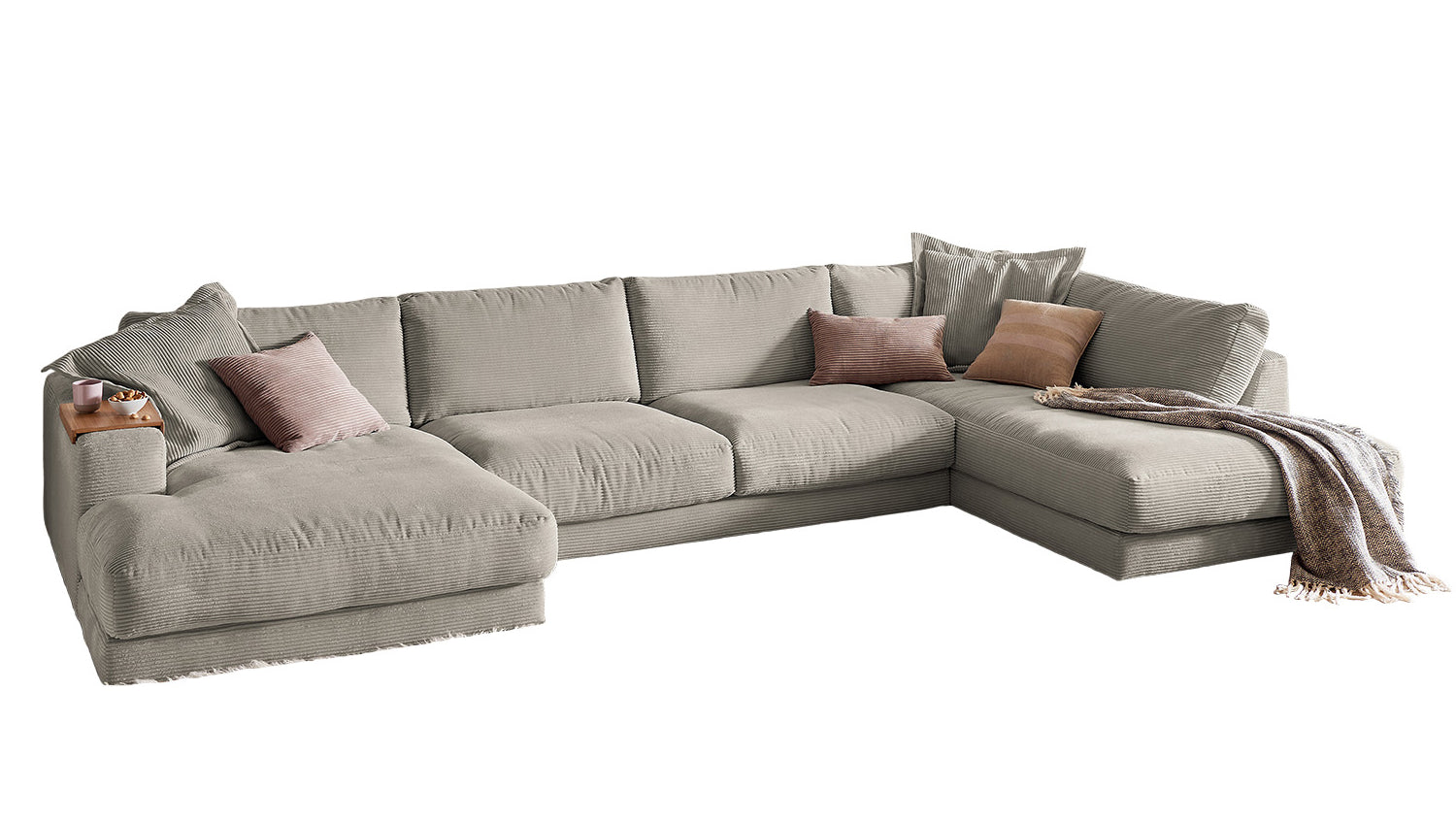 KAWOLA Sofá en forma de U MADELINE Pana de salón gris piedra
