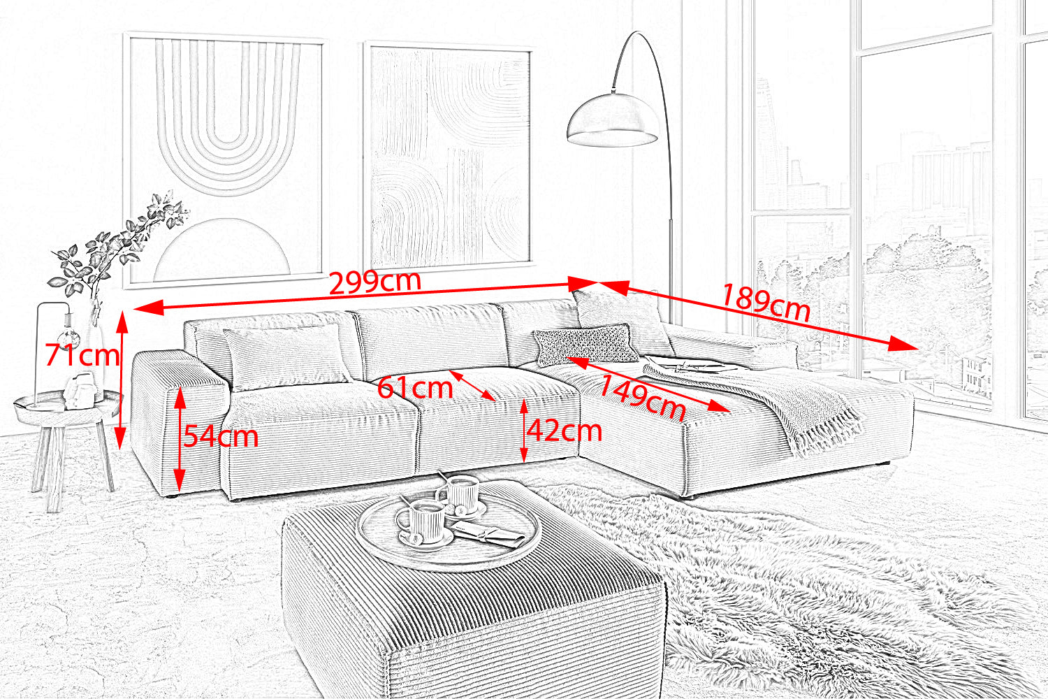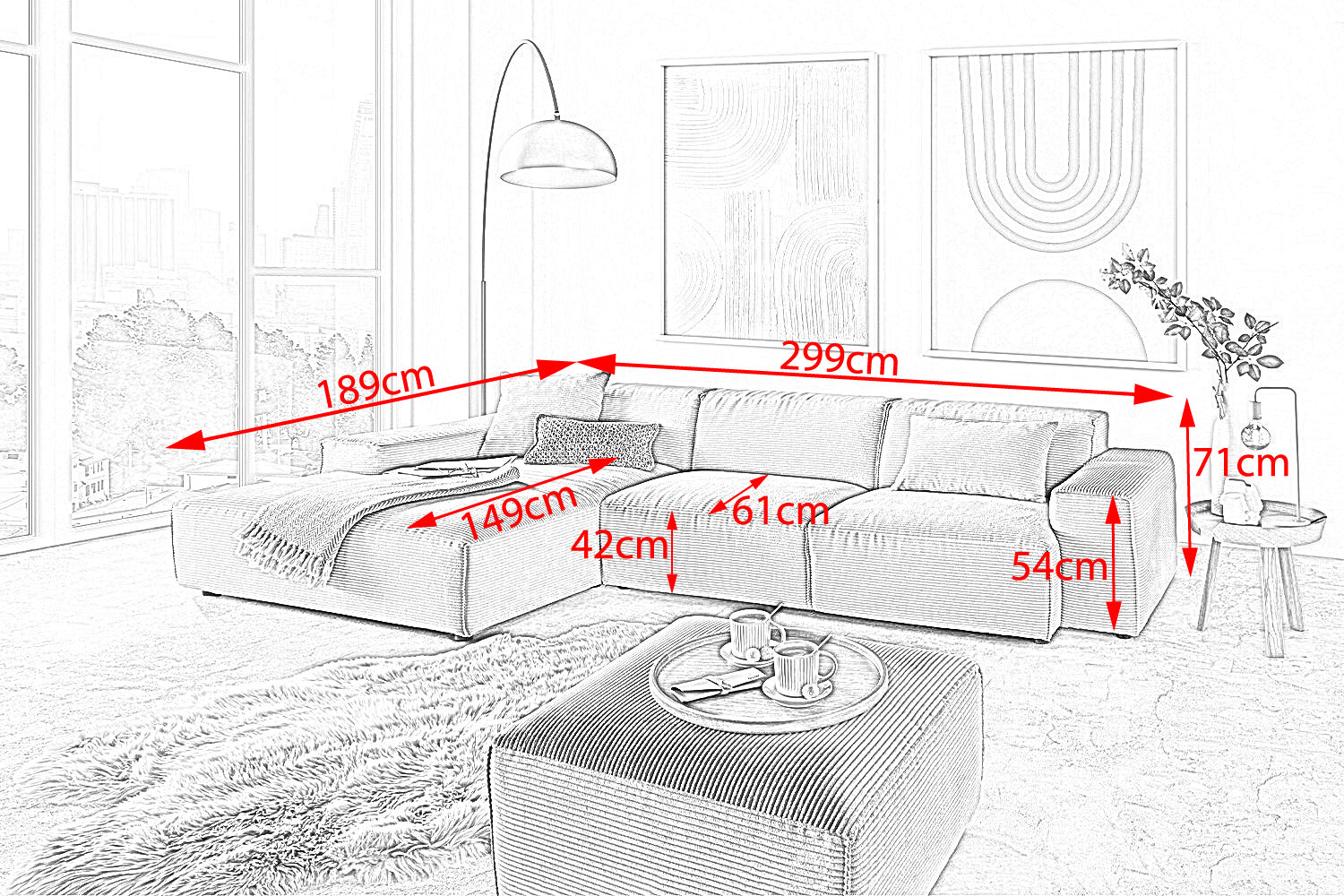Relájate en el cómodo sofá esquinero KAWOLA RANI con su acogedora tapicería de pana. La robusta estructura de madera maciza garantiza estabilidad y durabilidad, mientras que los mullidos asientos y respaldos con acolchado de espuma fría proporcionan un confort óptimo. El revestimiento de pana de moda no sólo es muy resistente, sino que también confiere al sofá un aspecto moderno y un tacto agradable. Gracias a su diseño atemporal, el sofá se integra fácilmente en cualquier ambiente. Es la elección perfecta para cualquiera que busque un sofá elegante y cómodo para el salón. Prepárese para reclinarse en nuestro sofá esquinero RANI y disfrutar de la vida! Instrucciones de cuidado Pana: Debe aspirar el sofá con regularidad, preferiblemente con un accesorio de cepillo suave. Utilice un producto de limpieza suave y un paño húmedo para eliminar las manchas. Utilice muy poca agua al limpiar y deje que la funda se seque completamente antes de usarla. Evite la luz solar directa para evitar que se decolore.