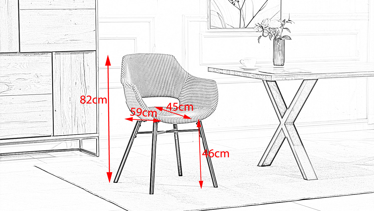 La silla tapizada ZAJA combina con elegancia comodidad y diseño moderno. La moderna funda de pana combinada con las patas de madera lacadas en negro hacen de esta silla de comedor un elemento destacado en cualquier comedor. Disfrute de horas de relax en la Mesa de comedor o utilice la silla como un cómodo asiento en el estudio. La robusta estructura metálica garantiza una gran capacidad de carga y durabilidad, mientras que la tela de pana no sólo es visualmente atractiva, sino también especialmente fácil de limpiar. Las pequeñas manchas pueden eliminarse fácilmente, de modo que la silla de comedor luce como nueva durante mucho tiempo. Su forma ergonómica y su agradable tapizado ofrecen un alto nivel de confort incluso cuando se está sentado durante largos periodos de tiempo. Ya sea en la cocina, en el comedor o en el despacho de casa, esta moderna silla de comedor se integra armoniosamente en cualquier ambiente. Las líneas claras y los materiales de alta calidad la convierten en un mueble atemporal que disfrutará durante mucho tiempo. Su estudiado diseño garantiza estabilidad y una gran capacidad de carga.