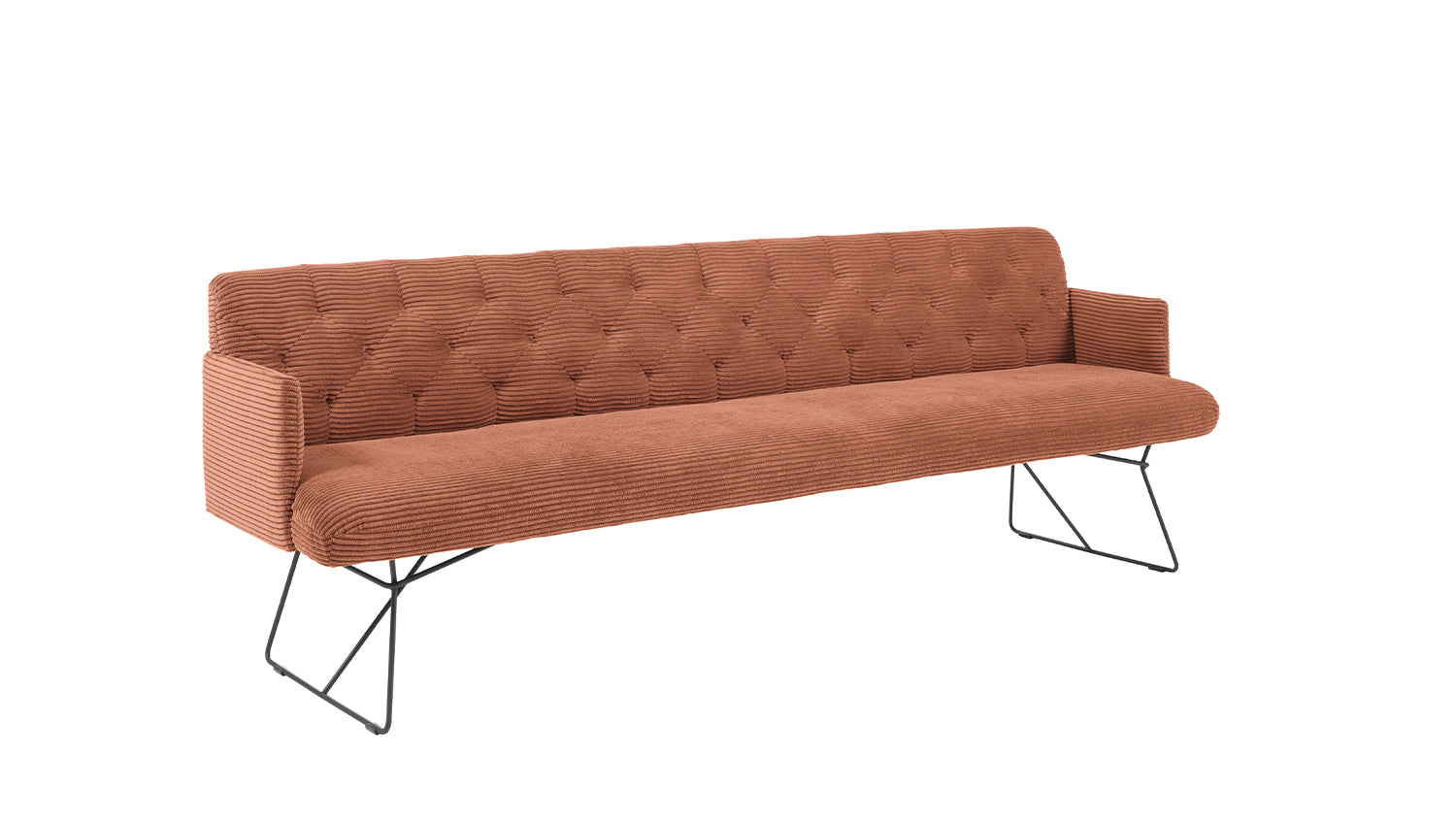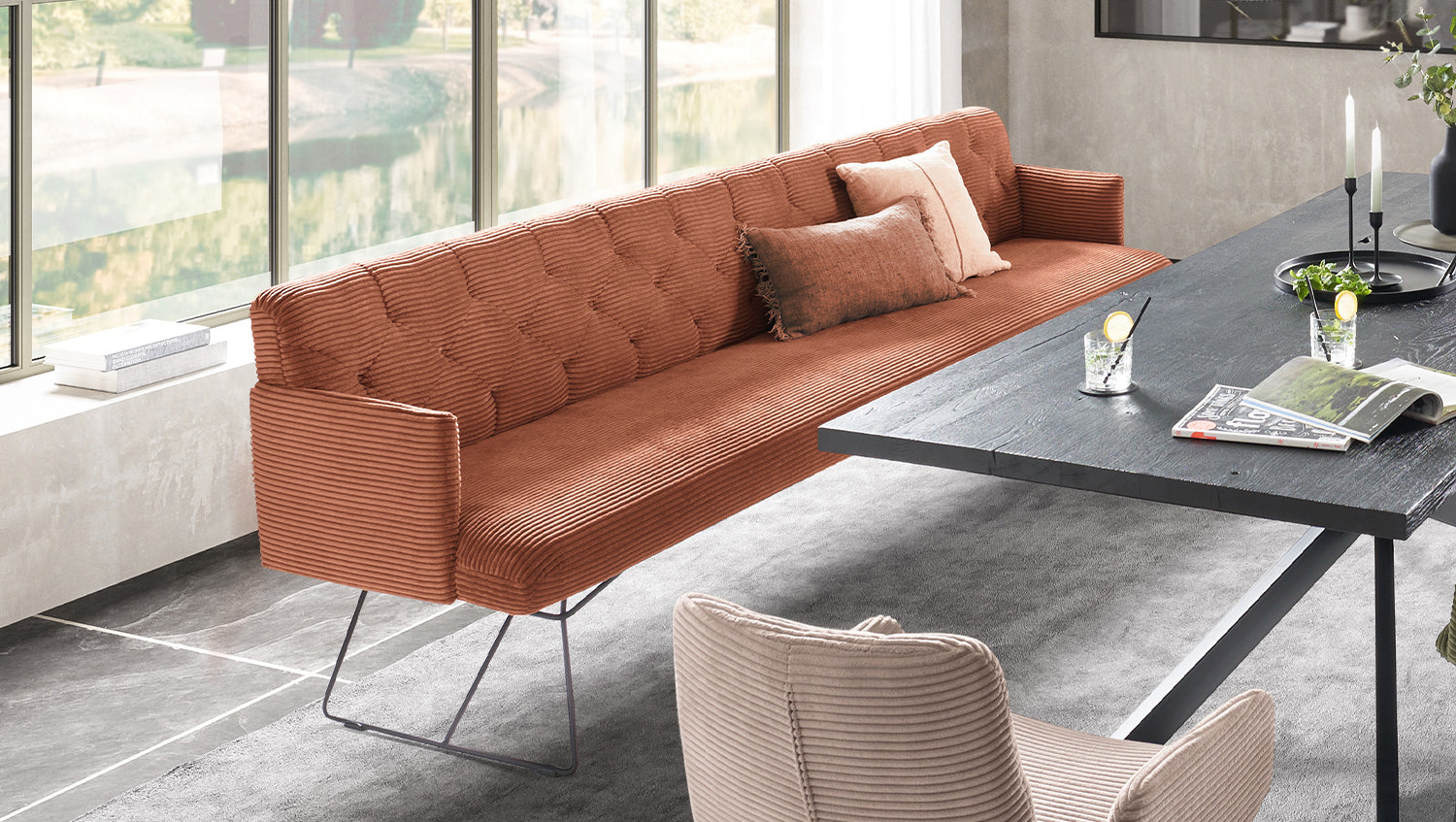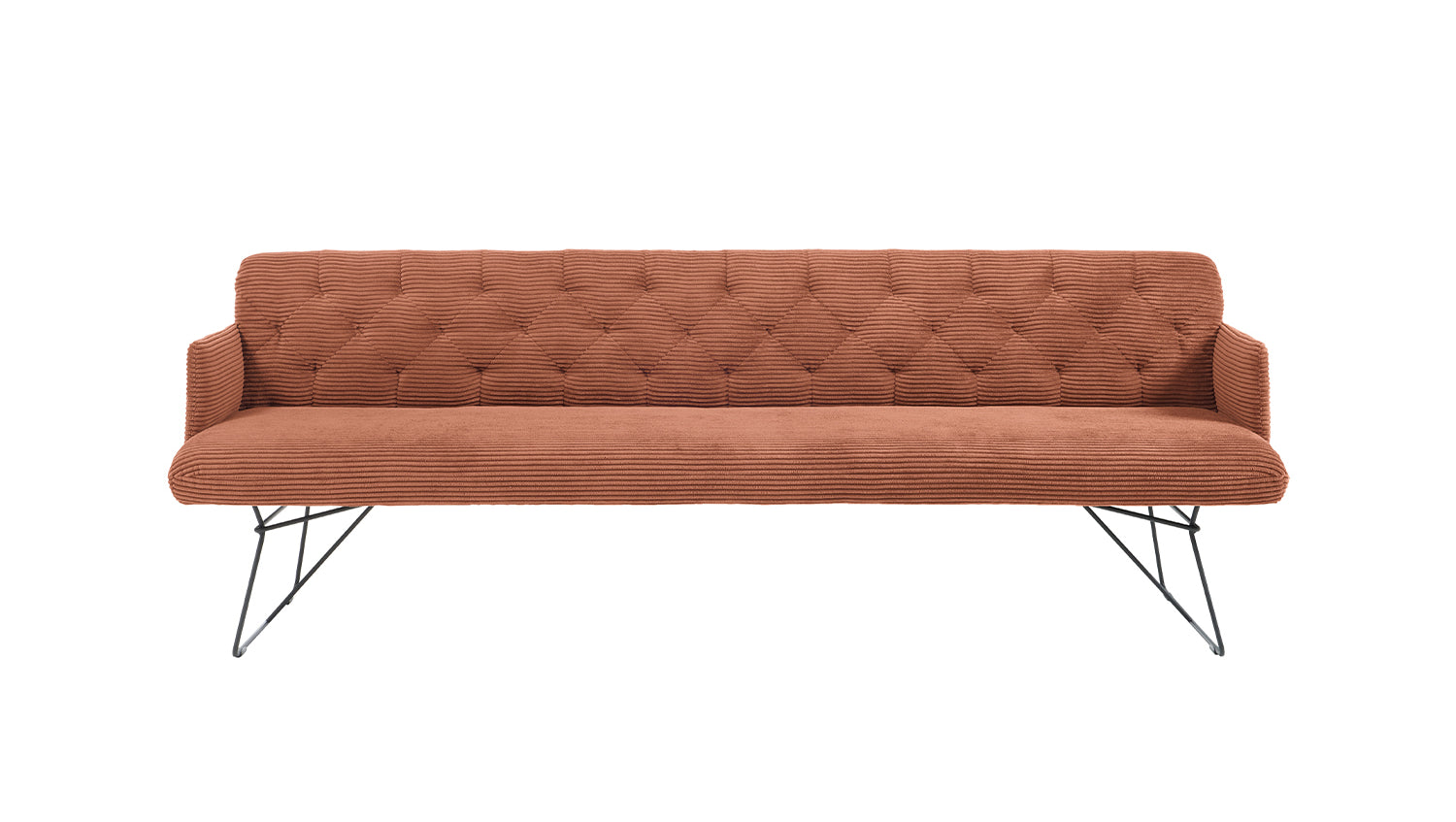 El banco de comedor KAWOLA CHARME aporta un aire vintage a cualquier habitación. Gracias a su diseño minimalista, el cómodo Banco tapizado se adapta a cualquier hogar e invita a pasar las tardes jugando con los amigos o la familia. El banco se caracteriza por su tapizado desenfadado y el elevado confort de asiento que conlleva. La estructura desenfadada del asiento es típica del modelo y el diseño ondulado acentúa el factor acogedor del banco. El acogedor tapizado se acentúa aún más con la suave funda de tela de pana de moda, que hace que la sensación del banco sea acogedora y cómoda. Como el banco de comedor CHARME está revestido totalmente de tela, también se puede colocar en cualquier lugar de la habitación. El Banco tapizado encaja perfectamente en su hogar gracias a sus pies de alambre y a su elegante tapizado de pana. El banco tiene capacidad para cuatro personas que pueden disfrutar de una comodidad de asiento sin restricciones.