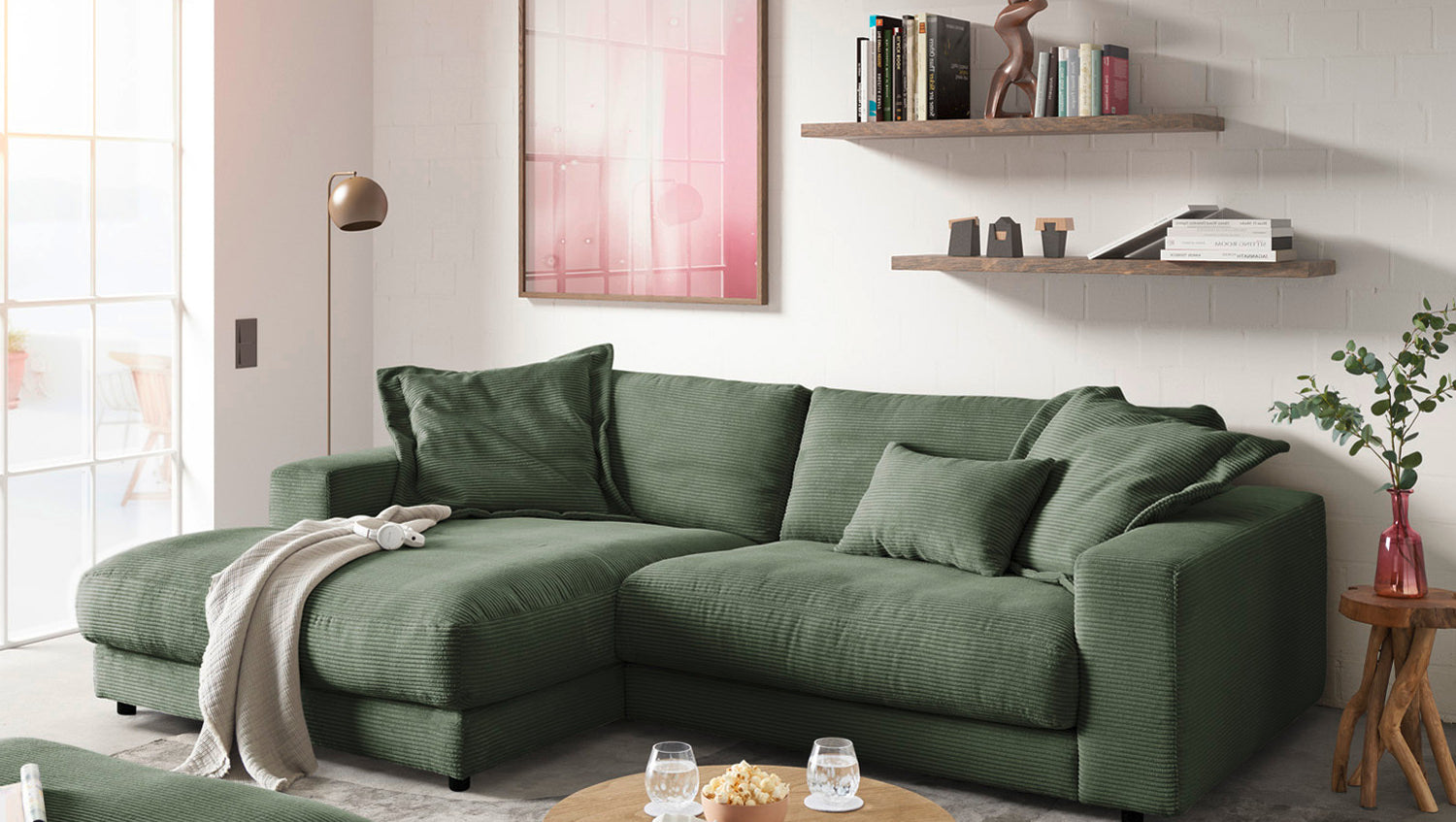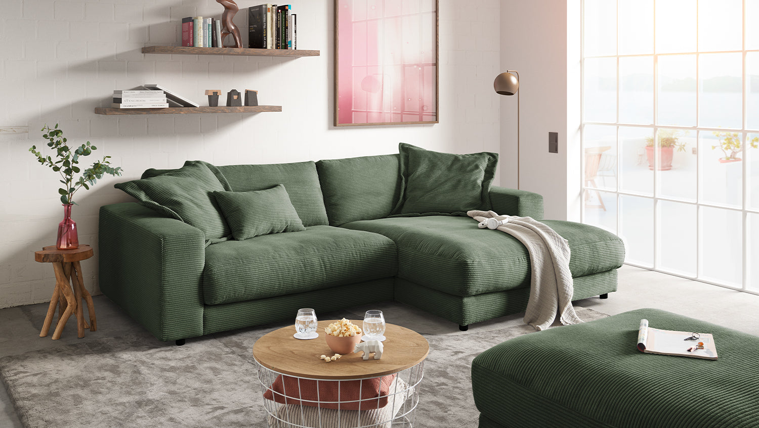 KAWOLA Sofá MADELINE Sofá esquinero con sillón Pana verde oliva