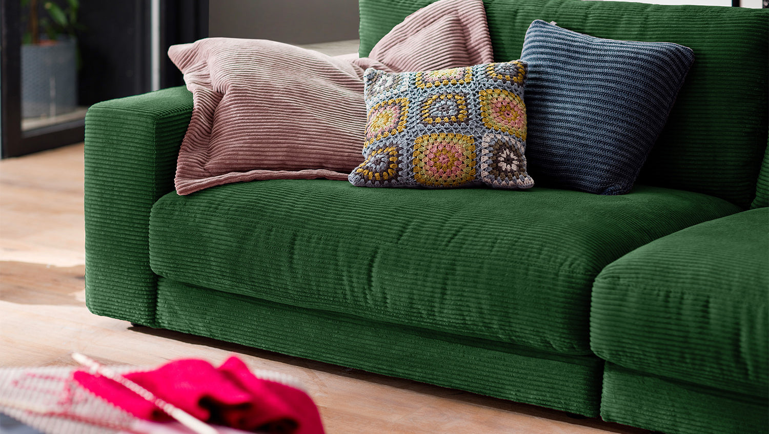 El sofá de 3 plazas MADELINE de KAWOLA impresiona por su extraordinaria comodidad de asiento, que se debe a la tapicería extremadamente desenfadada e invita a quedarse y relajarse. El tapizado se adapta a la forma del cuerpo; las impresiones del asiento y las ondulaciones de las fundas son típicas del producto. El asiento consta de una base de muelles con muelles ondulados de acero de elasticidad permanente y una funda superior, así como cojines de asiento sueltos de espuma de poliuretano. El asiento y el respaldo están tapizados con un relleno de alta calidad que contiene una mezcla de plumas. La funda de la moderna tela de pana confiere a este sillón de 3 plazas una elegancia atemporal. Si quiere dar a su salón un toque extraordinario, el sofá MADELINE es sin duda la elección acertada.