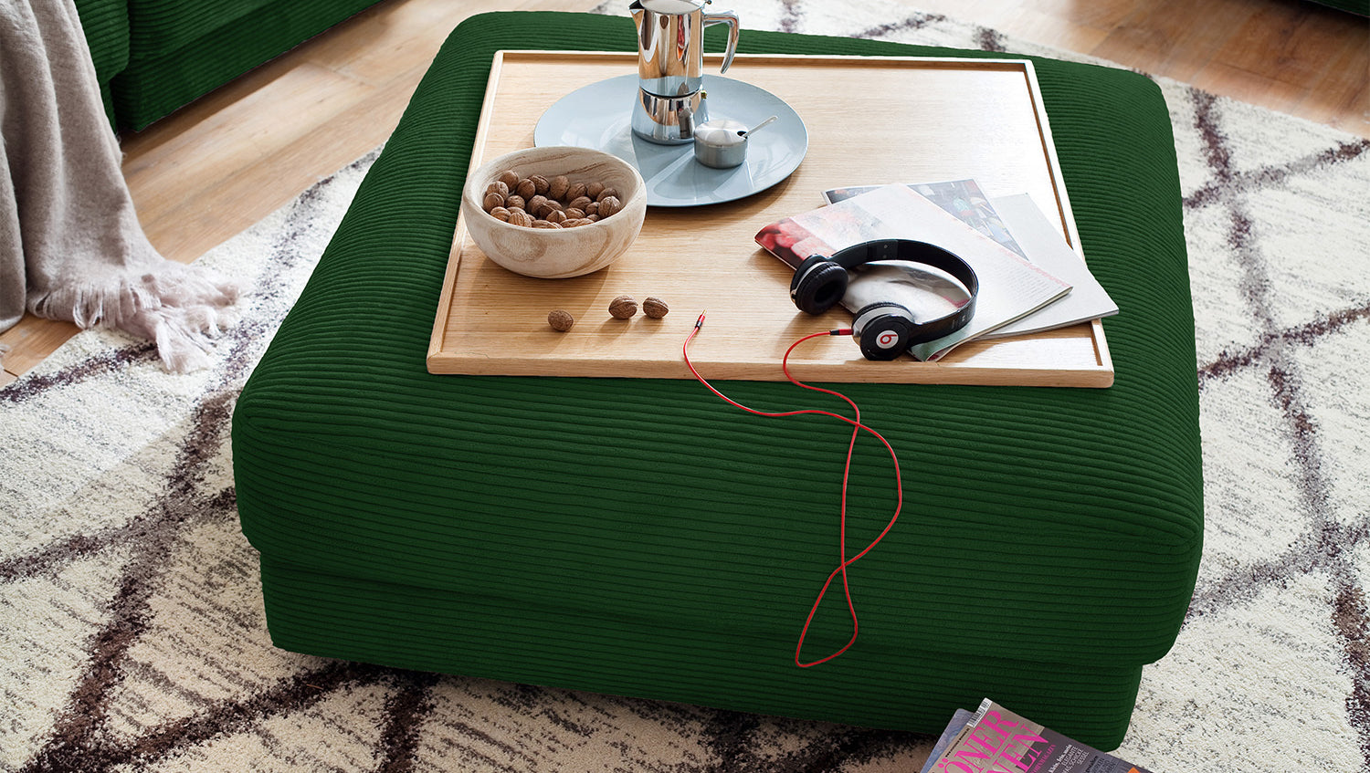 KAWOLA Gran taburete MADELINE taburete tapizado Pana esmeralda