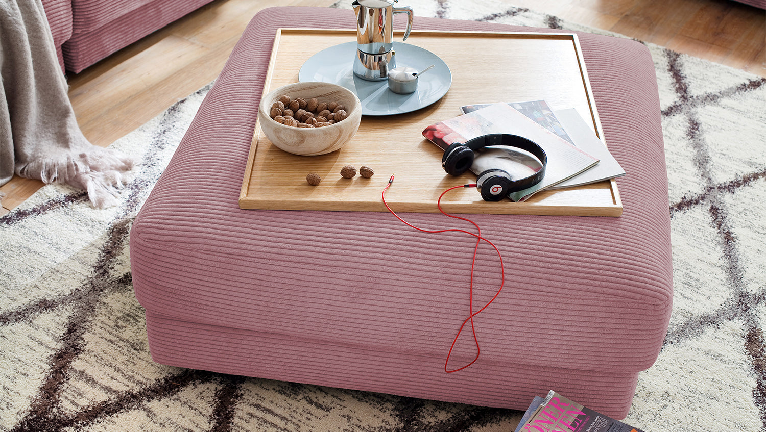 KAWOLA Taburete grande MADELINE taburete tapizado Pana rosa