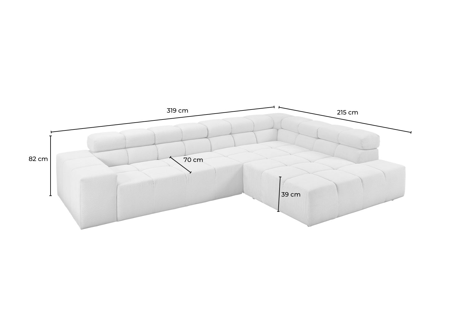 El sofá esquinero NEVADA de KAWOLA combina los mundos del diseño moderno con una elegancia atemporal y se integra a la perfección en cualquier interior. Su forma cúbica y sus discretos pies deslizantes confieren al sofá cierta ligereza, acentuada por el acolchado cuadrado. Los reposacabezas pueden abatirse hacia arriba o hacia abajo para adaptarse a las preferencias individuales. La compleja tapicería de tres niveles garantiza también el máximo confort. Naturalmente, el respaldo del sofá también está tapizado en la delicada Pana fina, de modo que el sofá también destaca cuando se coloca libremente en la habitación. Cualquiera que sea la ocasión, el sofá NEVADA es el lugar ideal para relajarse. Entrega sin decoración