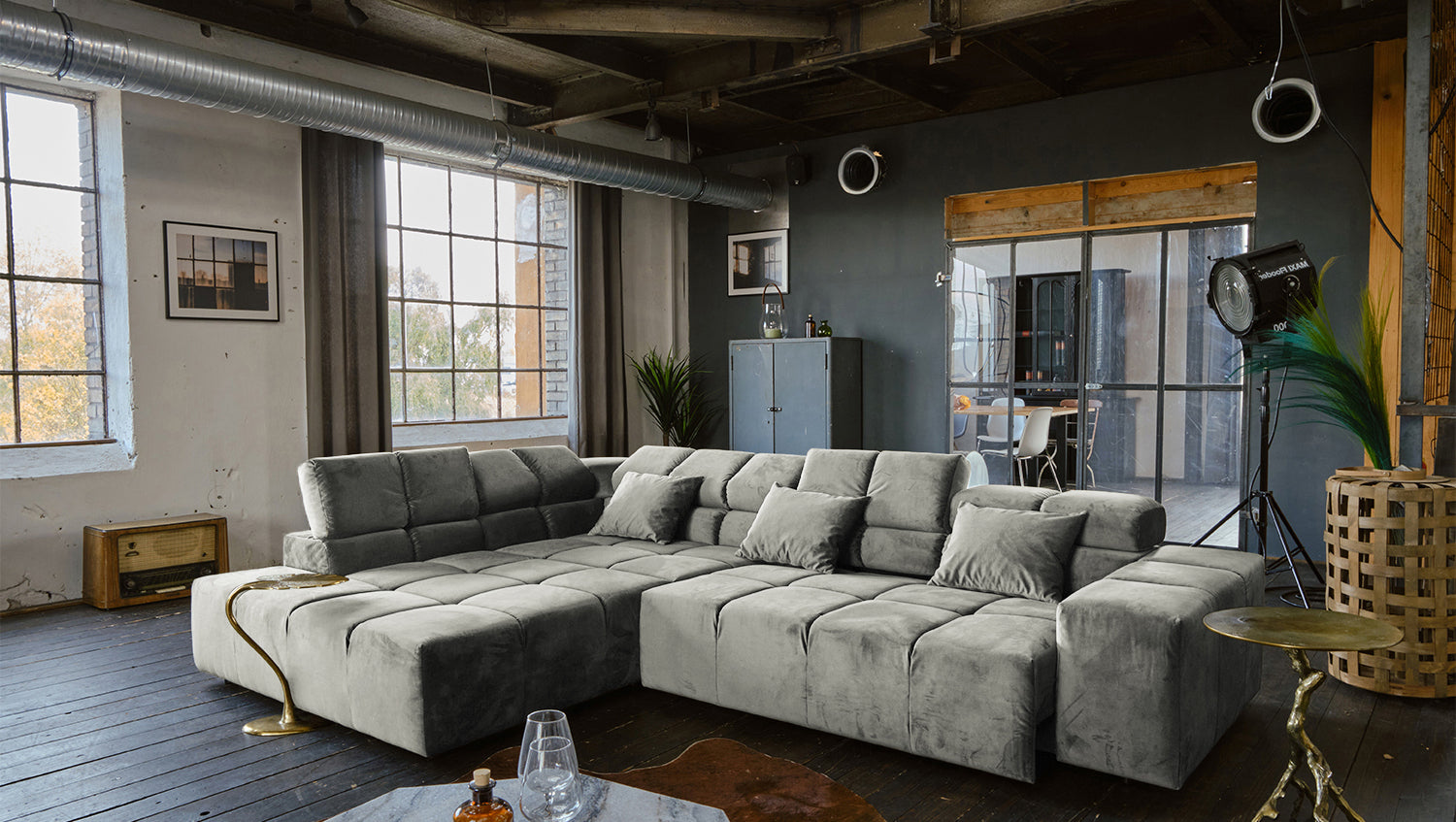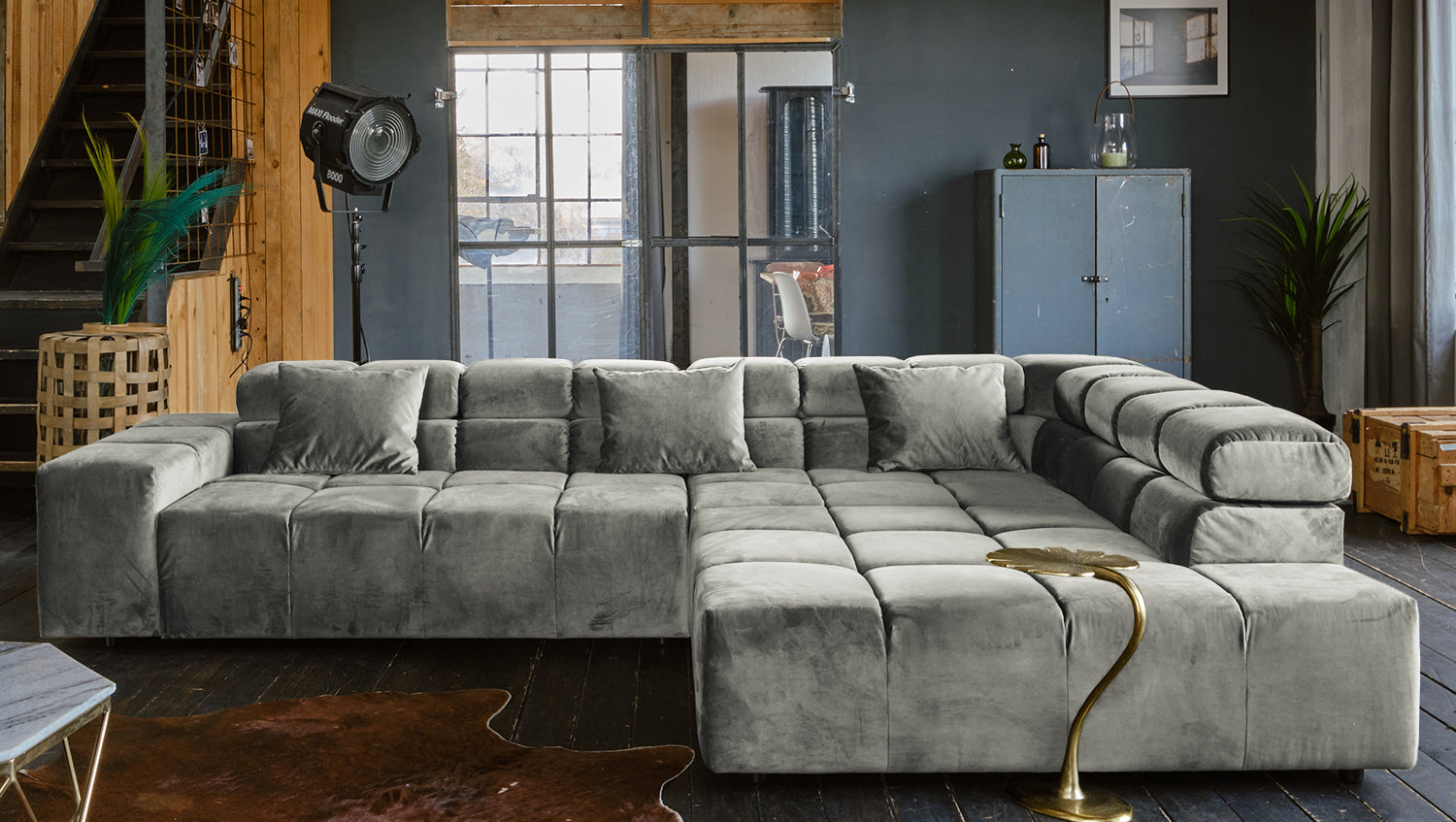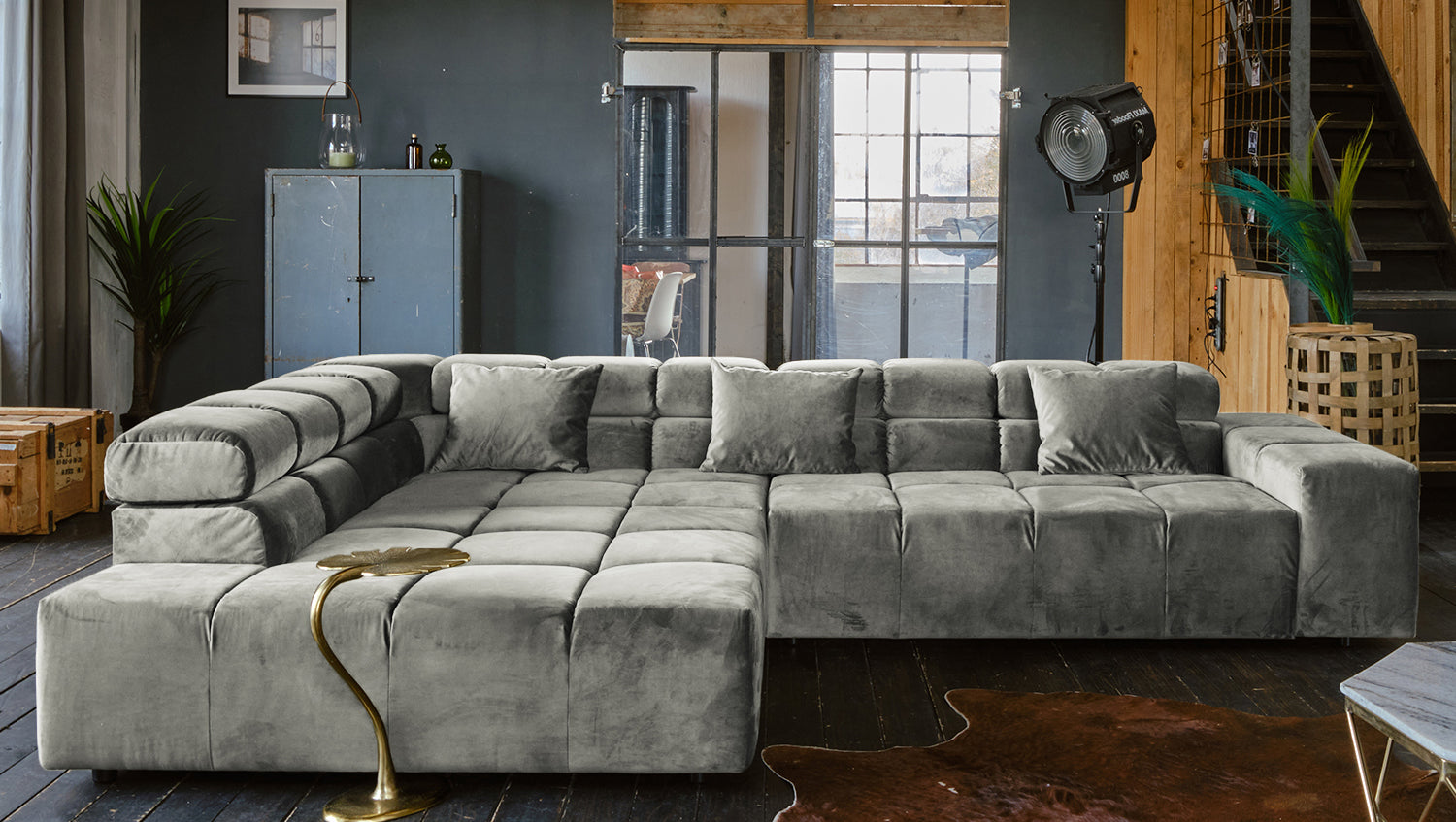 KAWOLA Sofá NEVADA Sofá esquinero Terciopelo plata