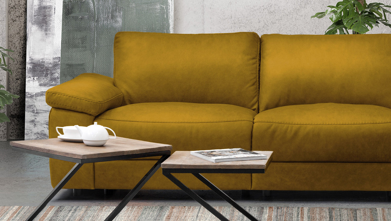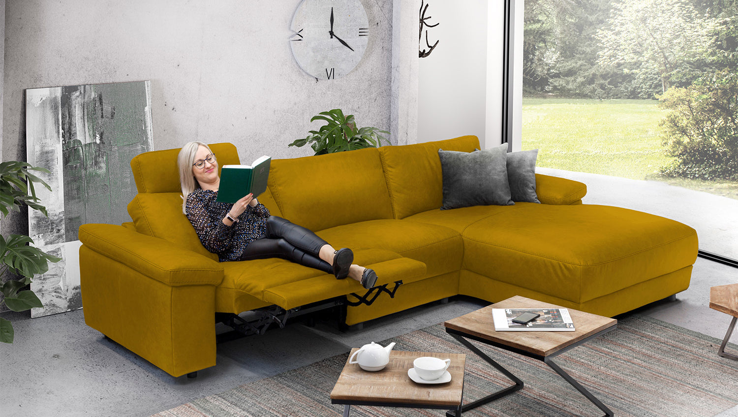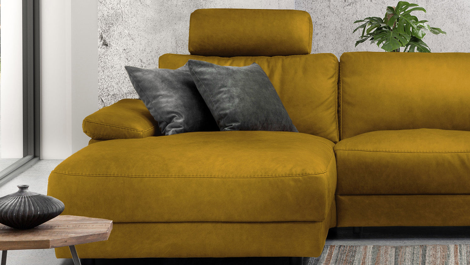 El sofá esquinero KAWOLA LOLA convence por su aspecto atemporal. Además, este mueble es muy funcional. El elemento de asiento derecho dispone de una función de reclinación motorizada que permite desplazar el respaldo hacia atrás y extender el reposapiés. Otro elemento destacado es el reposacabezas con aspecto de cojín, que también puede ajustarse a voluntad. El armazón es de madera maciza encolada y las superficies del asiento y el respaldo son muy cómodas gracias a su estructura de varias capas. La funda de tela de estilo vintage de alta calidad es muy fácil de cuidar y confiere al sofá una elegancia clásica. Los pies de plástico empotrados con aspecto flotante crean un atractivo contraste. El acolchado muy desenfadado del asiento, el respaldo y los reposabrazos ofrece además una gran comodidad de asiento. El sofá esquinero LOLA se integra a la perfección en cualquier entorno y destaca en cualquier lugar.