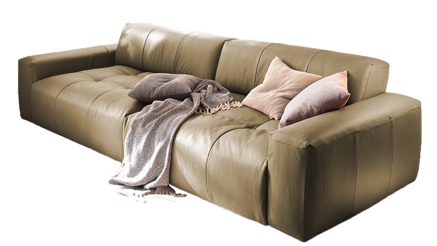 Sofá grande KAWOLA Palace de 3 plazas con ajuste de profundidad de asiento en piel oliva