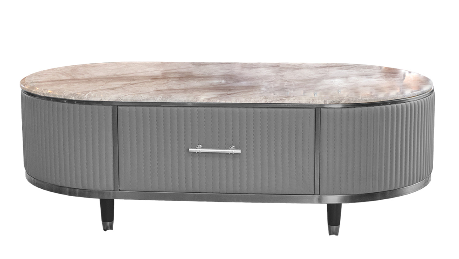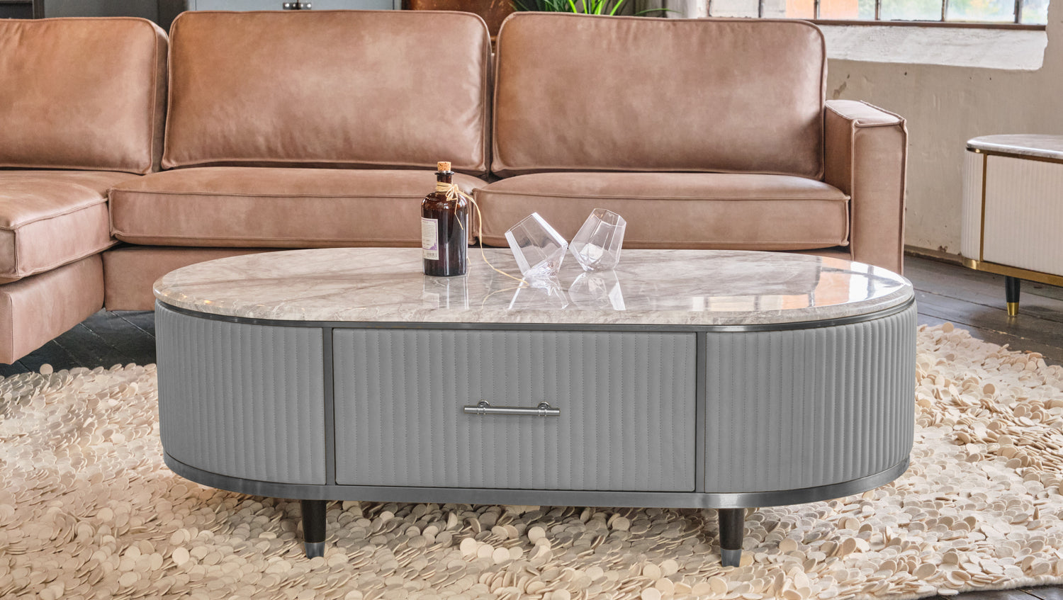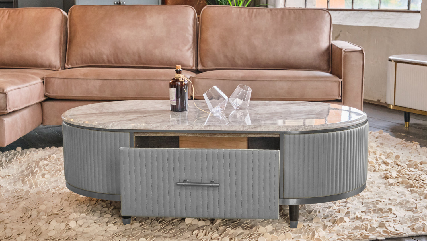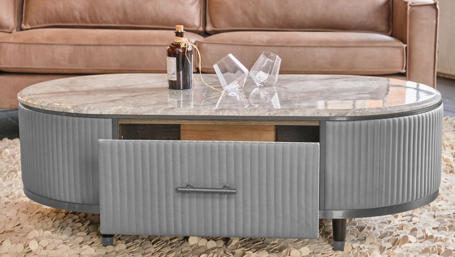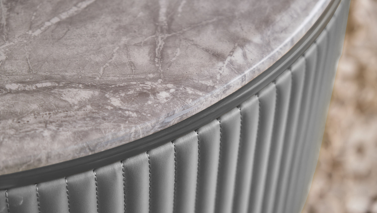 La mesa de centro KAWOLA MARIA llama la atención en cualquier hogar. Su nostálgico diseño retro al estilo de los años 50 se caracteriza sobre todo por la mezcla de materiales. El tablero de mármol gris claro y el elaborado frente de piel sintética crean un acertado contraste. Los pies plateados y los detalles de acero inoxidable completan el conjunto. Otros artículos de la gama MARIA añaden un mueble de buen gusto a su hogar.