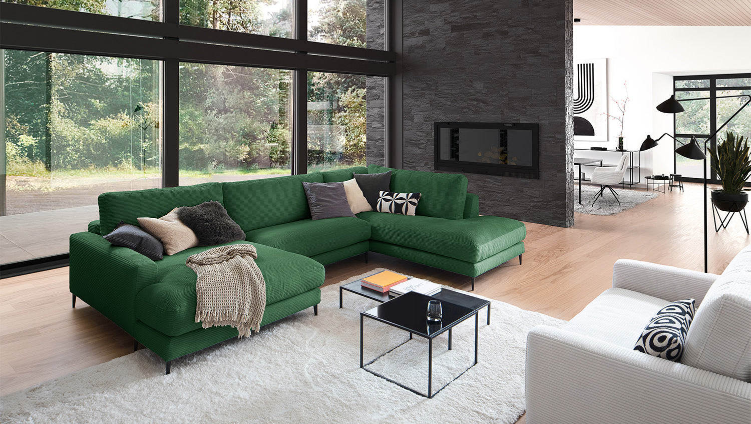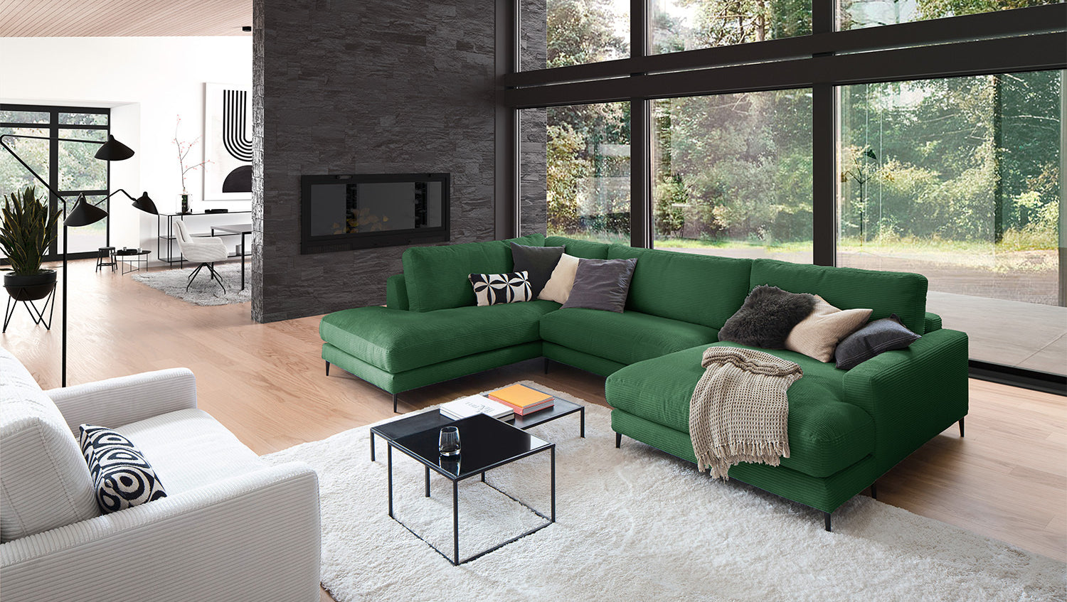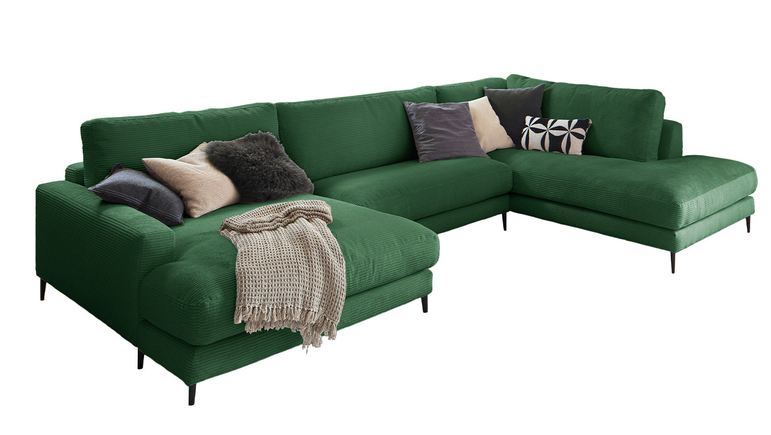 KAWOLA Sofá en forma de U CARA Pana esmeralda