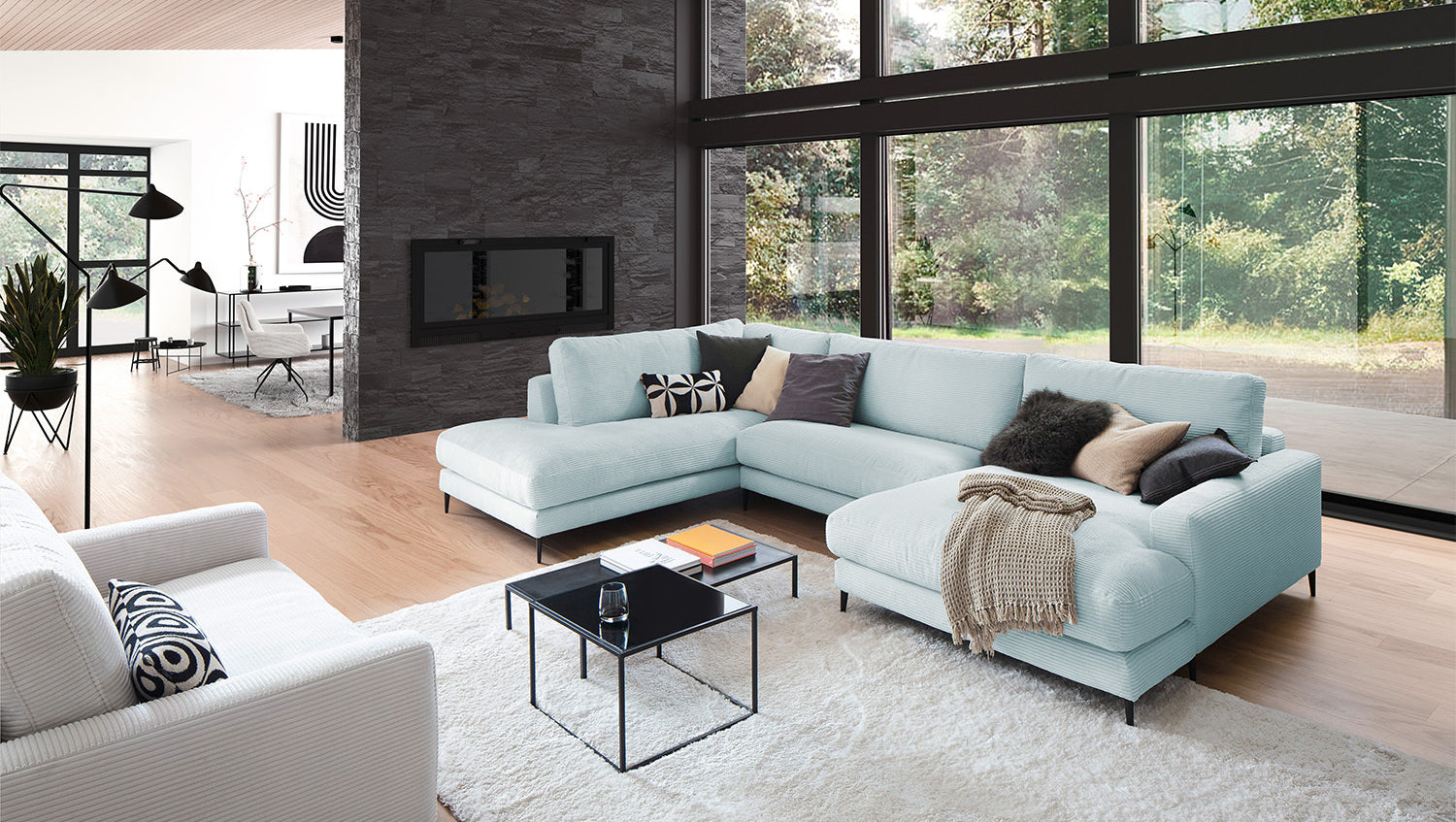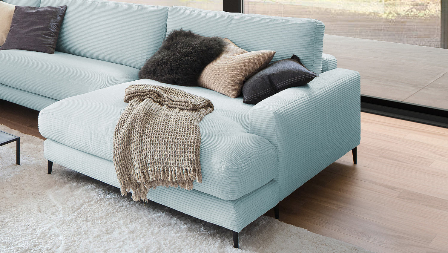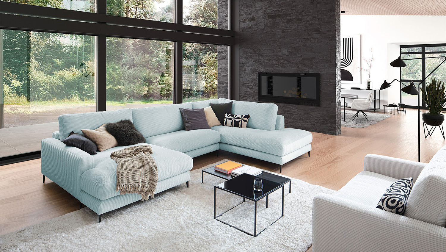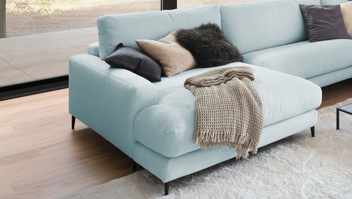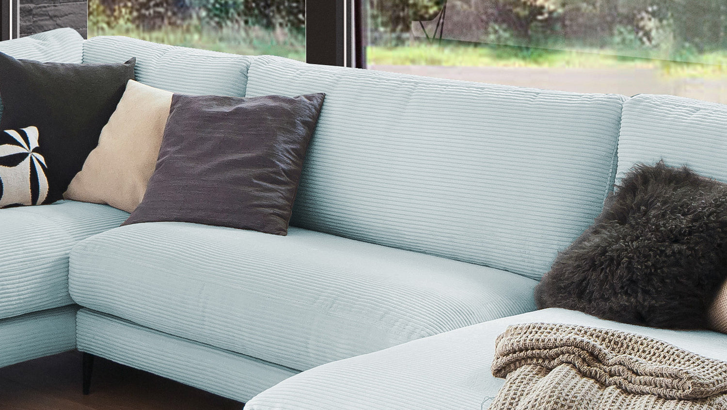 KAWOLA Sofá en forma de U CARA Pana azul claro