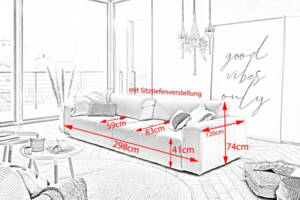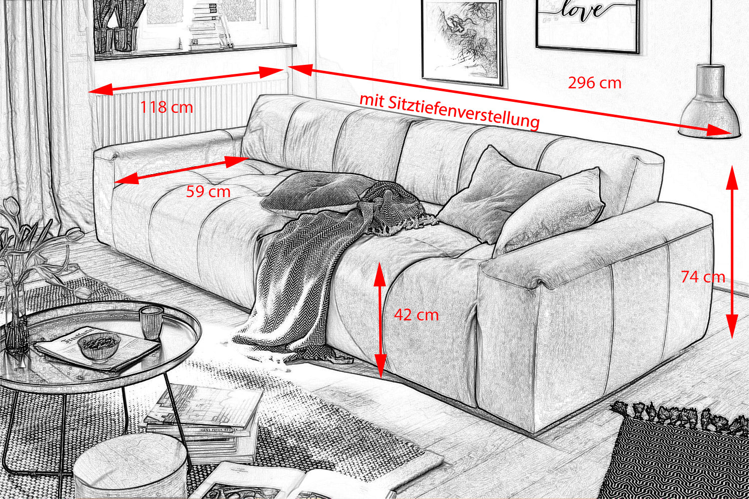 El sofá PALACE impresiona por su elegancia atemporal, su diseño moderno y su confort especialmente elevado. La resistente funda de cuero grueso cubre la acogedora superficie reclinable, cuyo desenfadado tapizado invita a relajarse y descansar. El extra especial: el sofá PALACE puede transformarse de un Sofá extra ancho en un mueble de asiento clásico en un abrir y cerrar de ojos. Gracias a la regulación de la profundidad del asiento, que se consigue ajustando el respaldo, la profundidad del asiento puede reducirse de 83 cm a 59 cm. Esto le permite decidir si prefiere una posición sentada más erguida o si prefiere tener espacio para estirarse. Nota: Cuando son nuevas, las fundas muestran un pronunciado patrón ondulado, que es intencionado debido al diseño, el modelo y la construcción. La tapicería se adaptará a la forma del cuerpo y la firmeza del asiento disminuirá ligeramente. Las ligeras diferencias en la firmeza del asiento de los grupos complementarios se deben al diseño y, por tanto, no son motivo de queja.