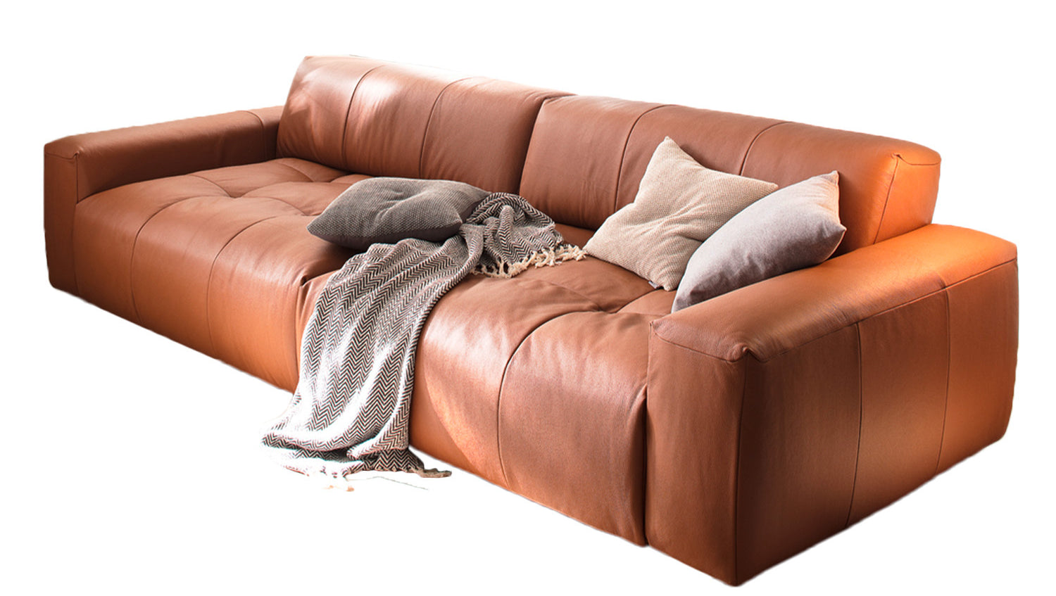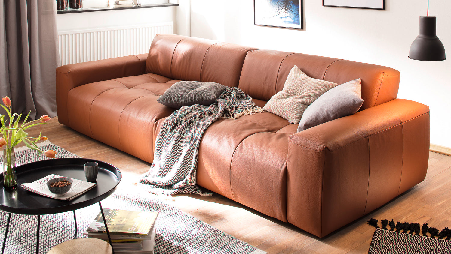 Sofá grande KAWOLA PALACE de 3 plazas con ajuste de profundidad de asiento en piel color coñac