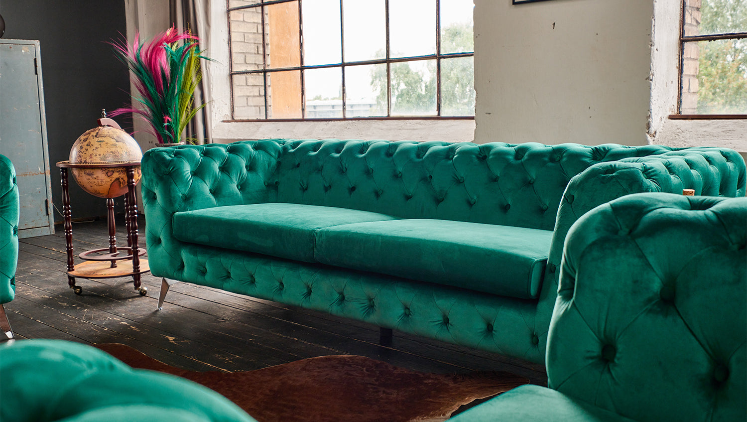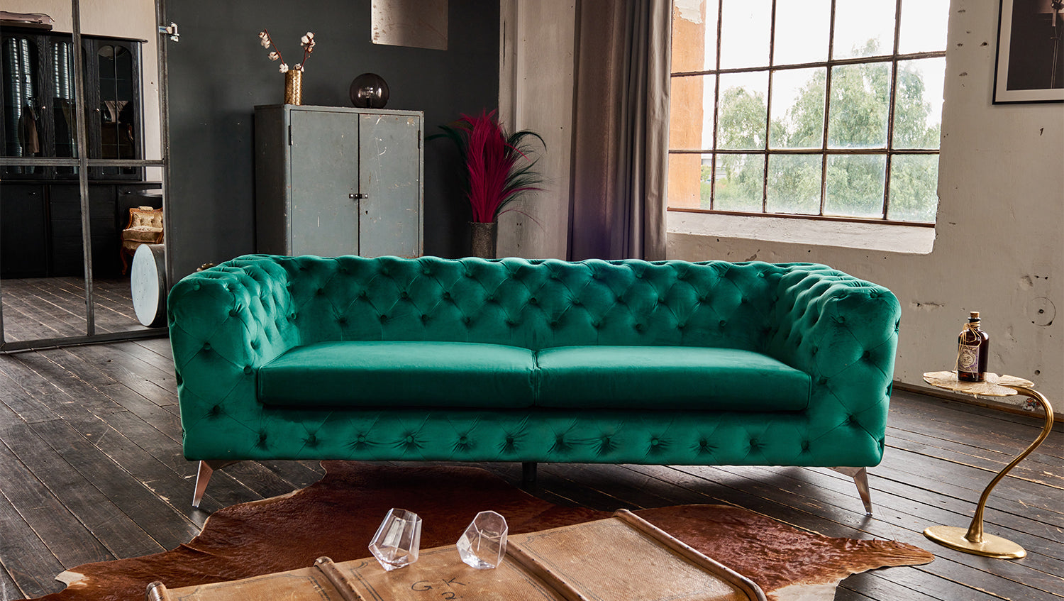 Sofá KAWOLA NARLA Chesterfield de 3 plazas de terciopelo verde