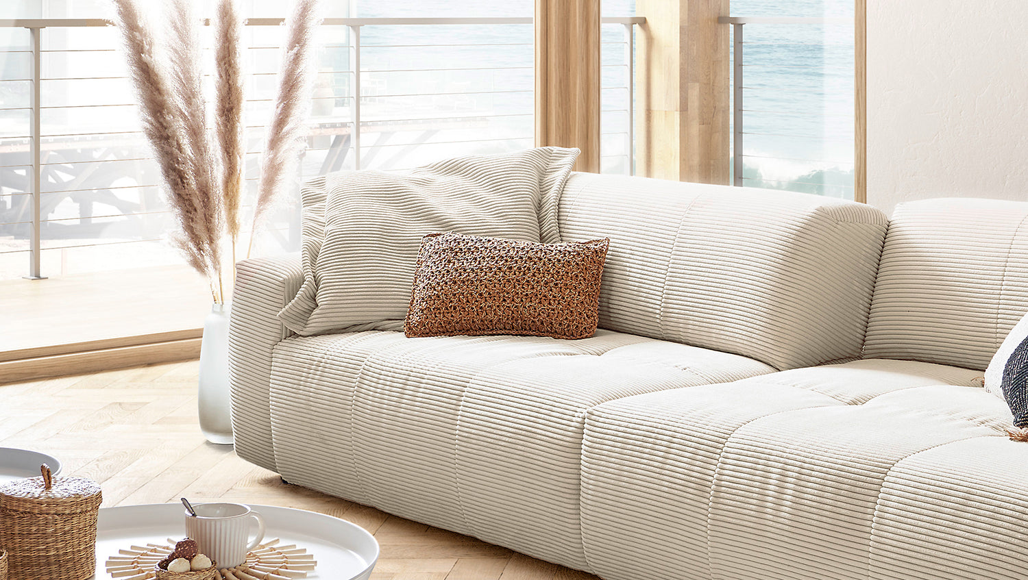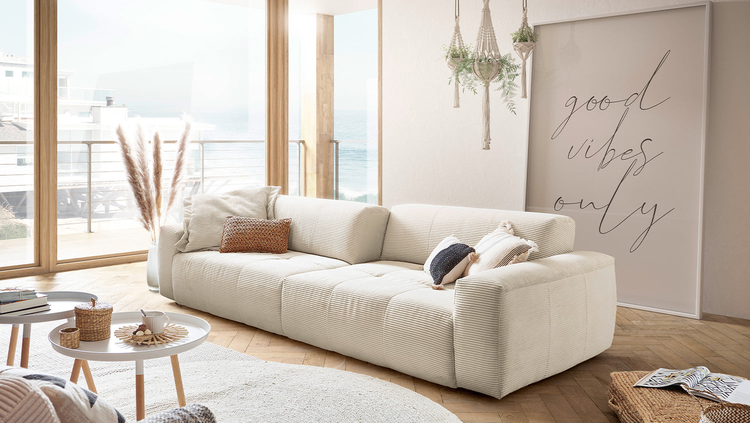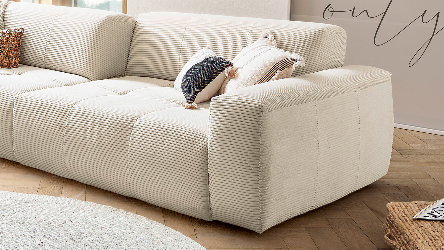 El sofá PALACE impresiona por su elegancia atemporal, su diseño moderno y su confort especialmente elevado. La moderna funda de pana es extrasuave y cubre la acogedora superficie reclinable, cuyo desenfadado tapizado invita a relajarse y descansar. El extra especial: el sofá PALACE puede transformarse de un Sofá extra ancho en un asiento clásico en un abrir y cerrar de ojos. Gracias a la regulación de la profundidad del asiento, que se consigue ajustando el respaldo, la profundidad del asiento puede reducirse de 83 cm a 59 cm. Esto le permite decidir si prefiere una posición sentada más erguida o si prefiere tener espacio para estirarse. Nota: Cuando son nuevas, las fundas muestran un pronunciado patrón ondulado, que es intencionado debido al diseño, el modelo y la construcción. La tapicería se adaptará a la forma del cuerpo y la firmeza del asiento disminuirá ligeramente. Las ligeras diferencias en la firmeza del asiento de los grupos complementarios se deben al diseño y, por tanto, no son motivo de queja.