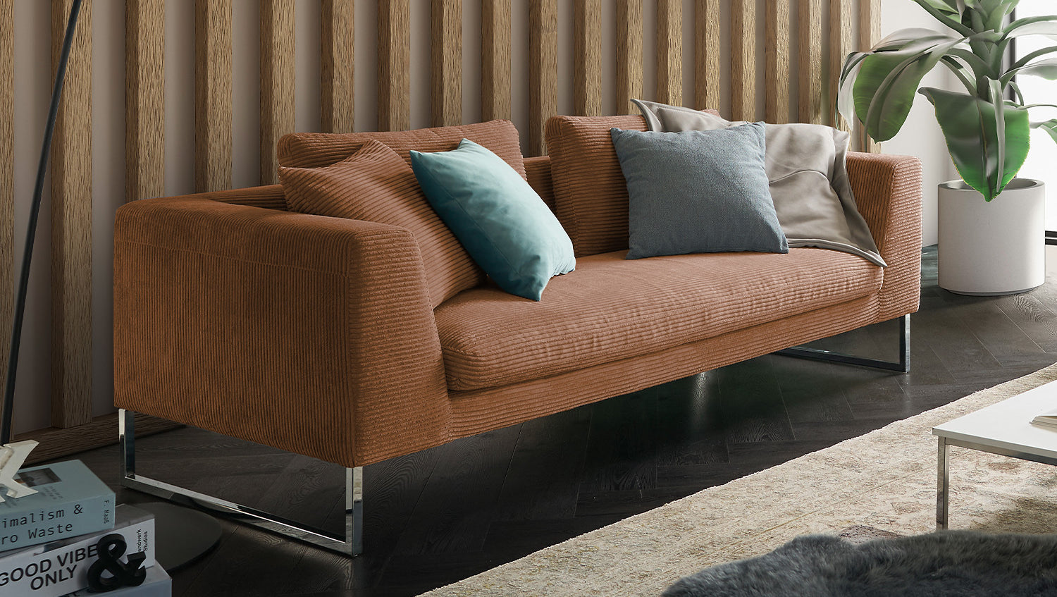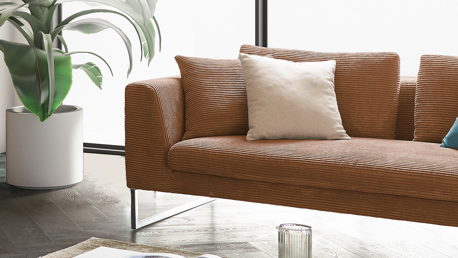 Con el sofá Arian, encontrará su nuevo lugar favorito en casa. La tapicería desenfadada y especialmente suave se adapta a la forma de su cuerpo y garantiza la máxima comodidad de asiento. Las impresiones del asiento y las ondulaciones de las fundas son típicas del producto. La funda de pana de alta calidad en combinación con los elegantes pies cromados confieren a su salón una elegancia moderna y atemporal. Gracias a la funda a prueba de respaldos, el sofá también puede colocarse en cualquier lugar de la habitación y podrá dar rienda suelta a su creatividad de diseño. Dé un nuevo esplendor a su hogar con el sofá Arian.