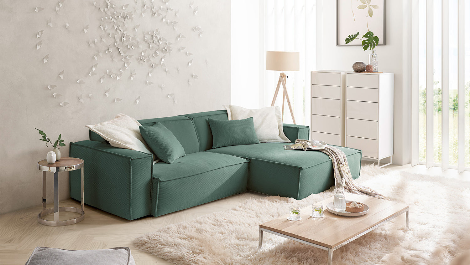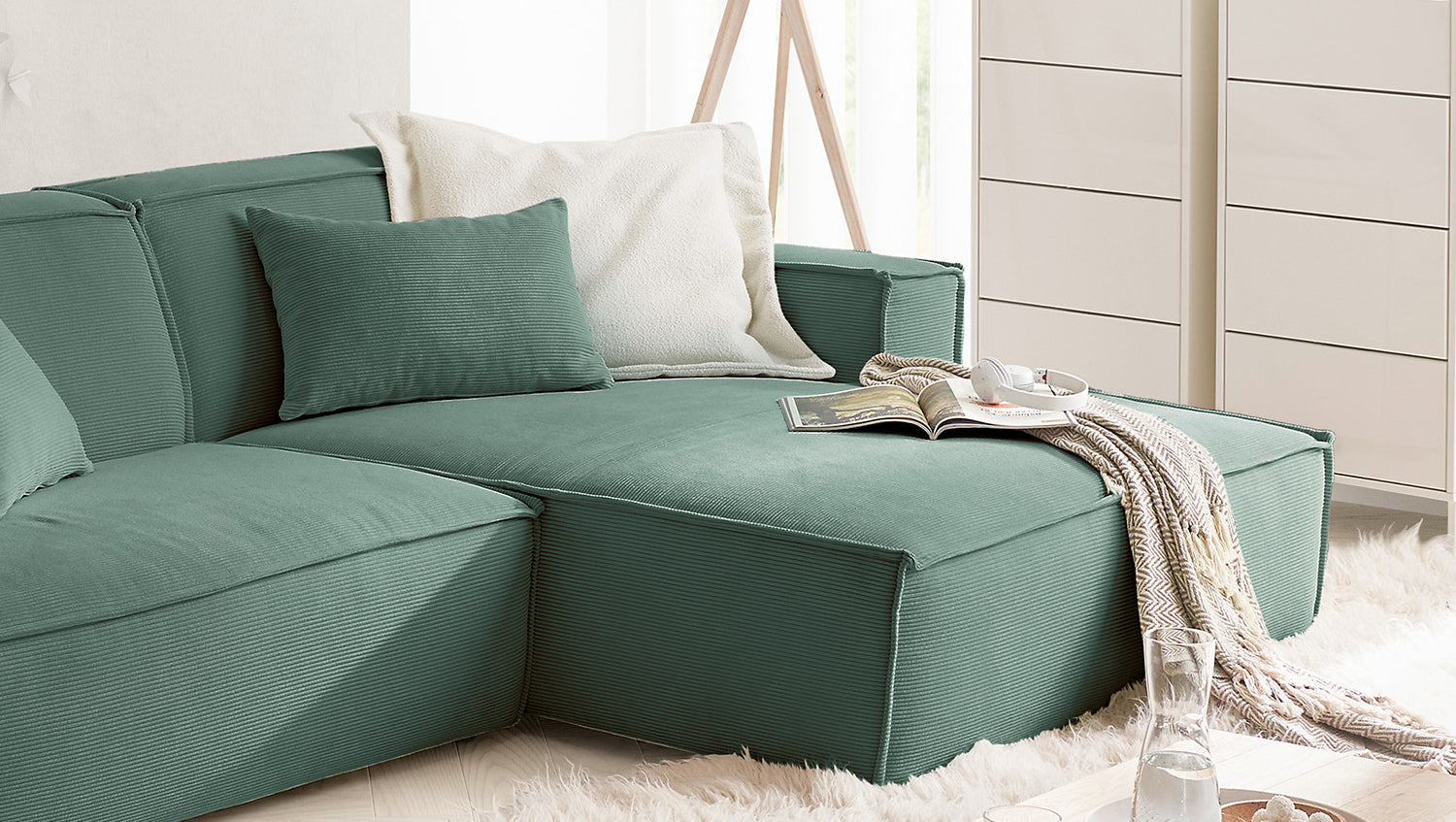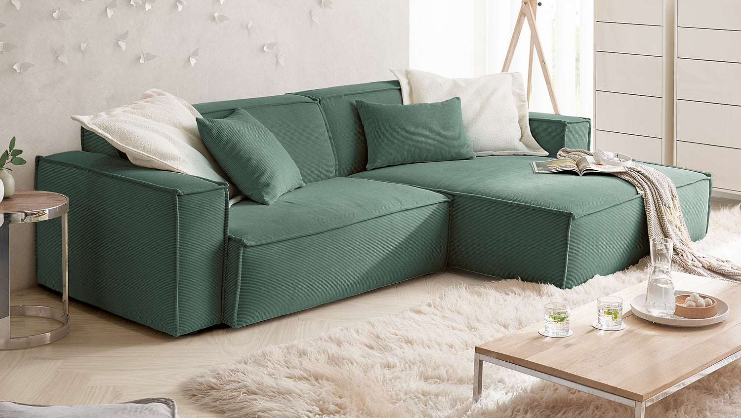 KAWOLA Sofá SAMU Sofá esquinero Pana fina verde