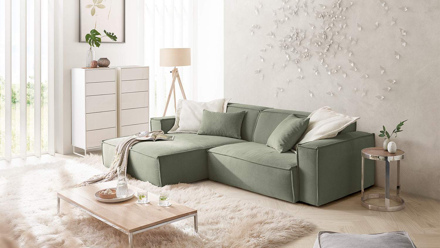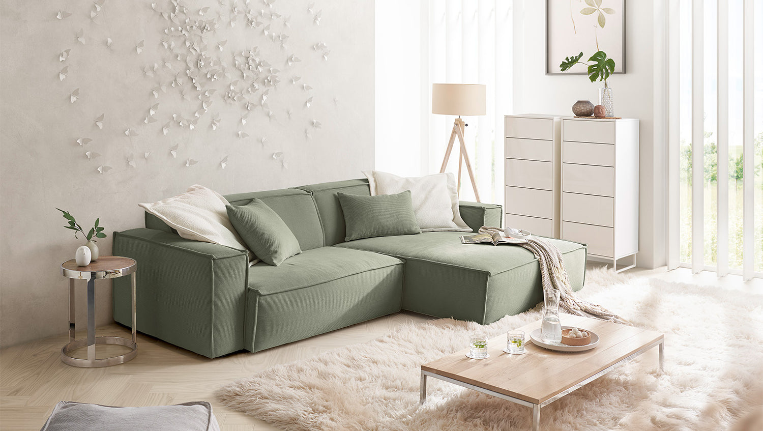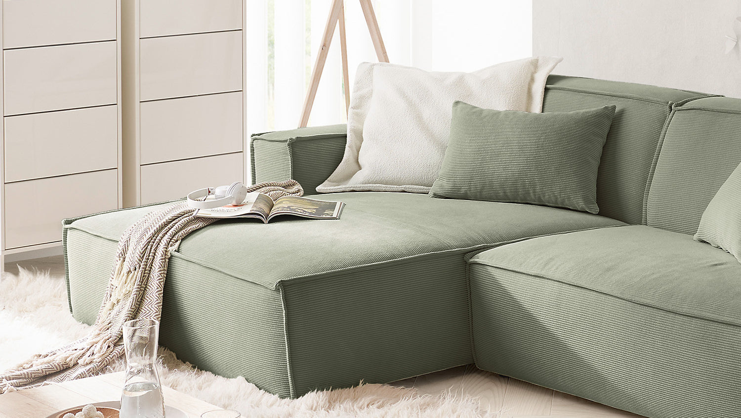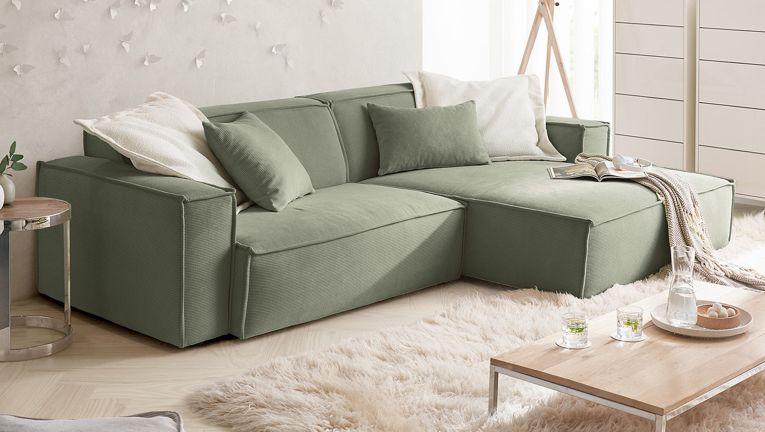 KAWOLA Sofá SAMU Sofá esquinero Pana fina verde oliva