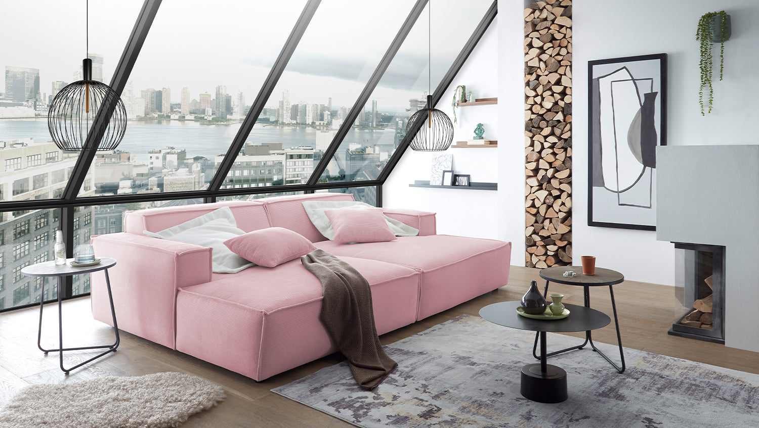 KAWOLA Sofá extra ancho SAMU pana fina rosa
