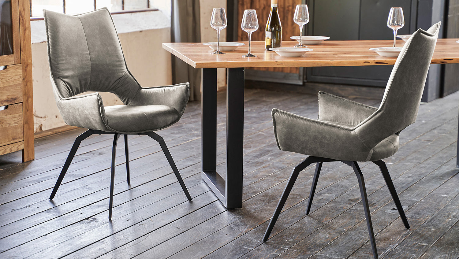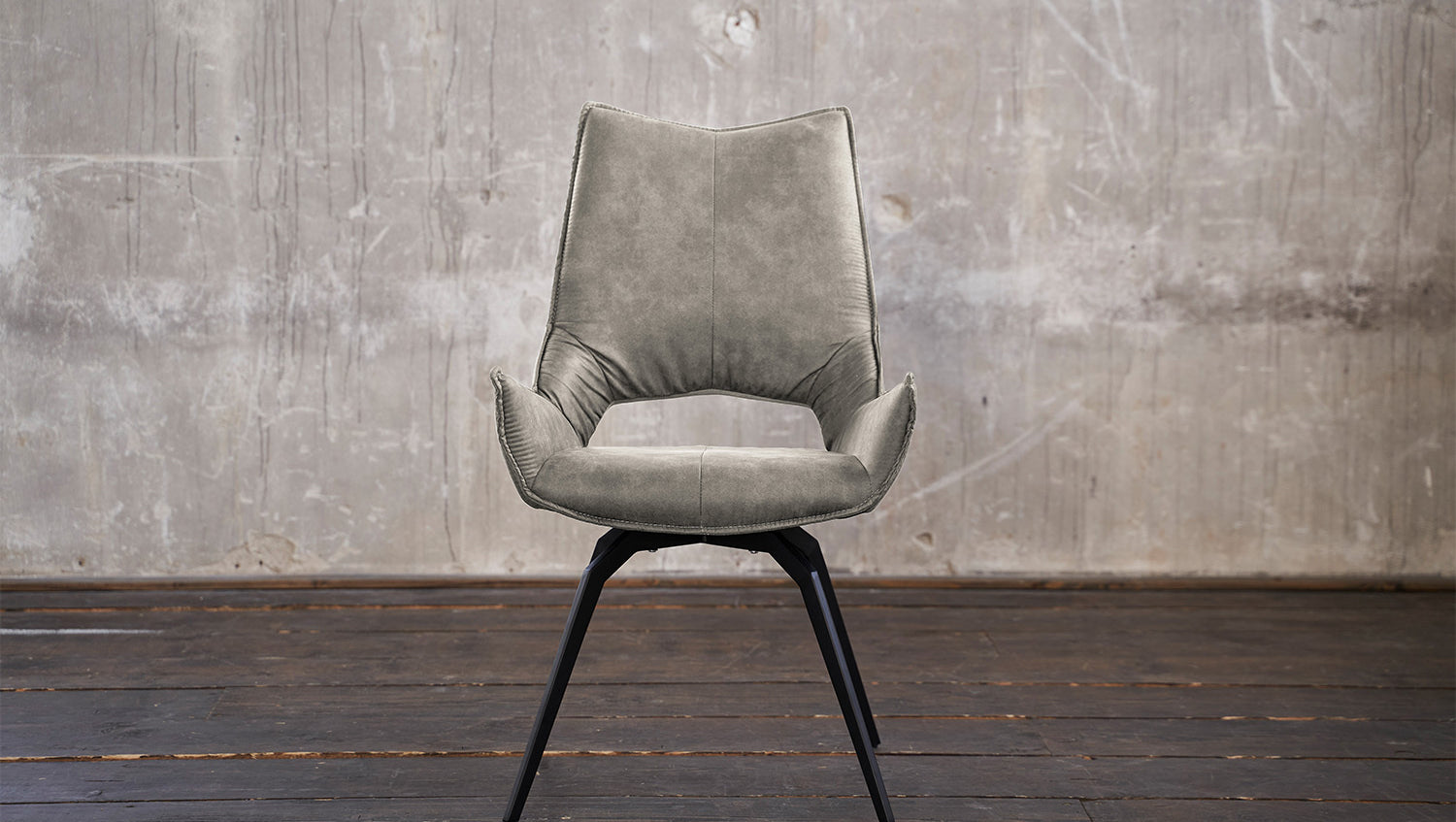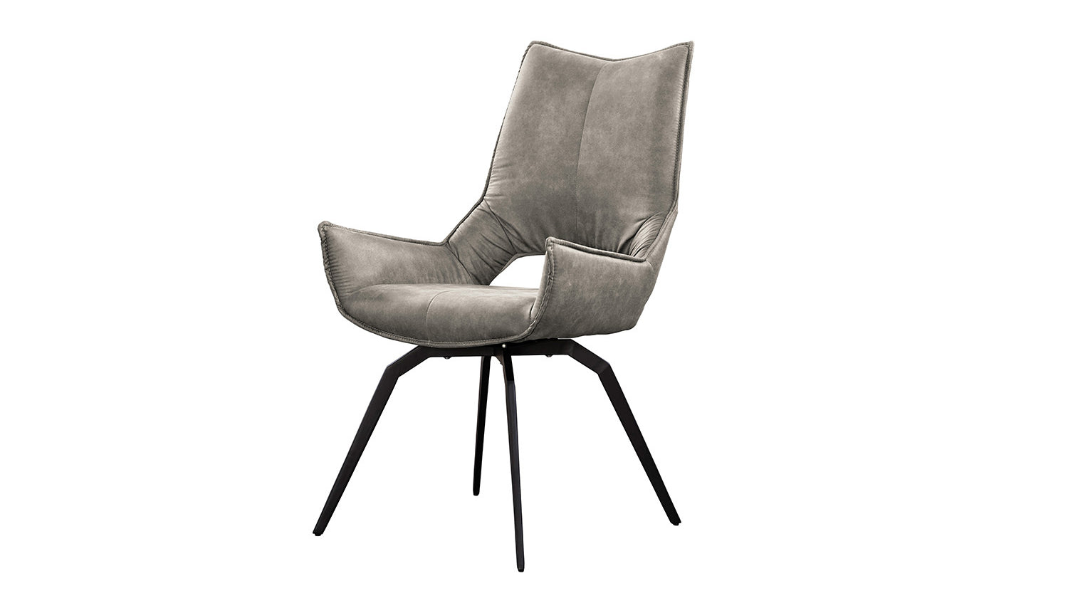 La silla de comedor SIVO llama inmediatamente la atención por su interesante forma. Tanto la carcasa del asiento, cómodamente acolchada, como las patas giratorias en ángulo tienen un diseño inusual. En la carcasa del asiento, que por lo demás es continua, hay un hueco en la parte inferior del respaldo que completa su aspecto especial. La funda de tela de la silla giratoria es fácil de cuidar y muy agradable al tacto. La silla tapizada es ideal para el comedor o la zona de trabajo en casa, como silla en la sala de espera o como silla de reuniones en la oficina.